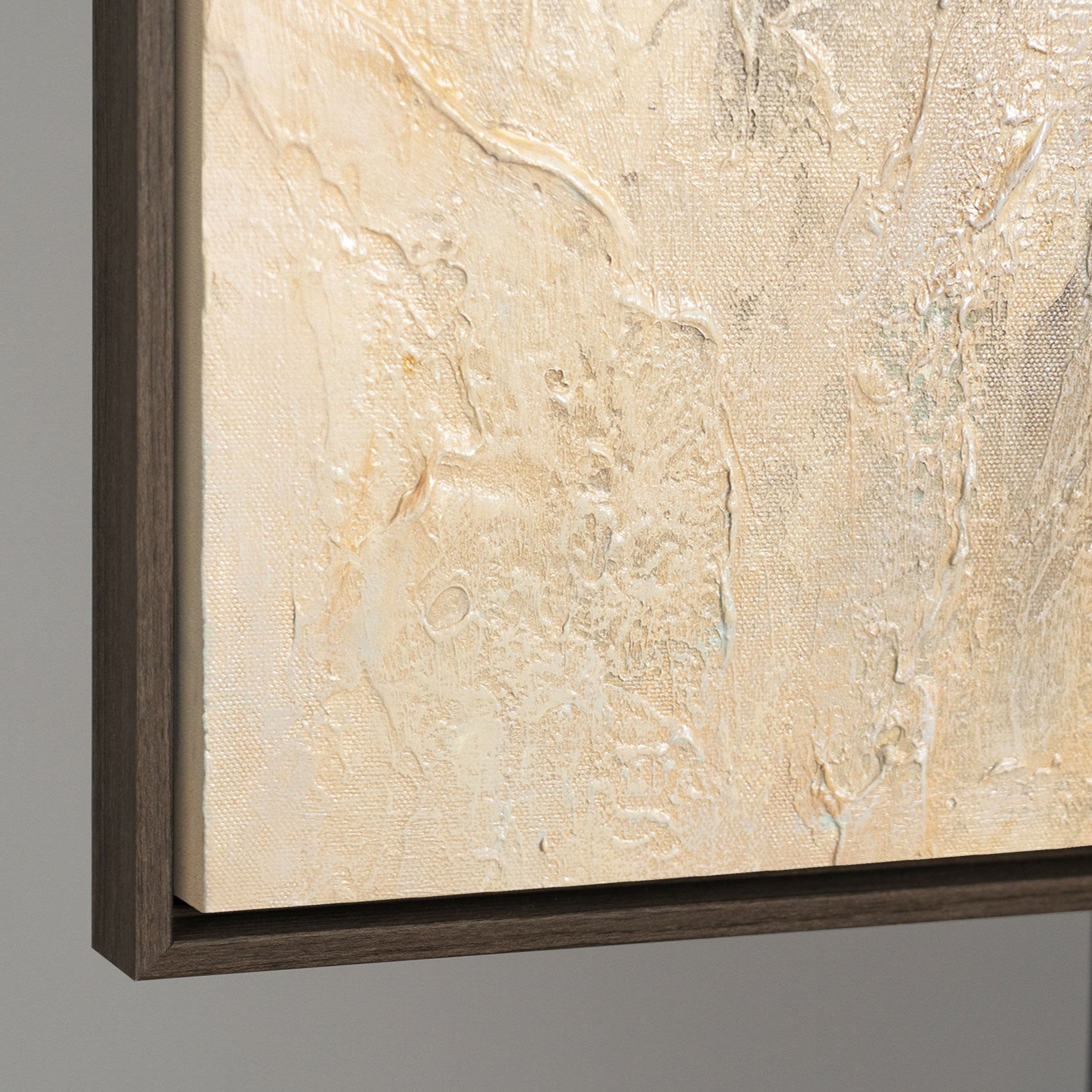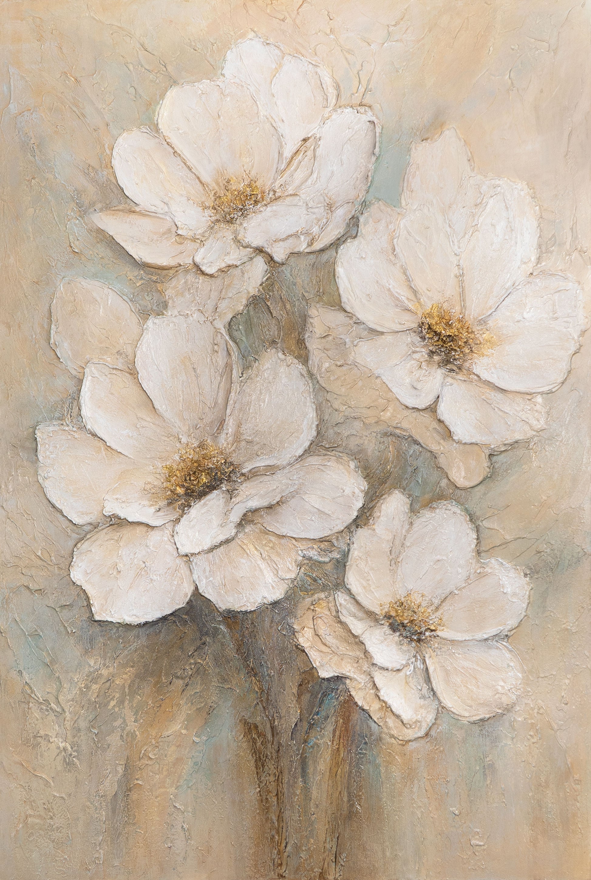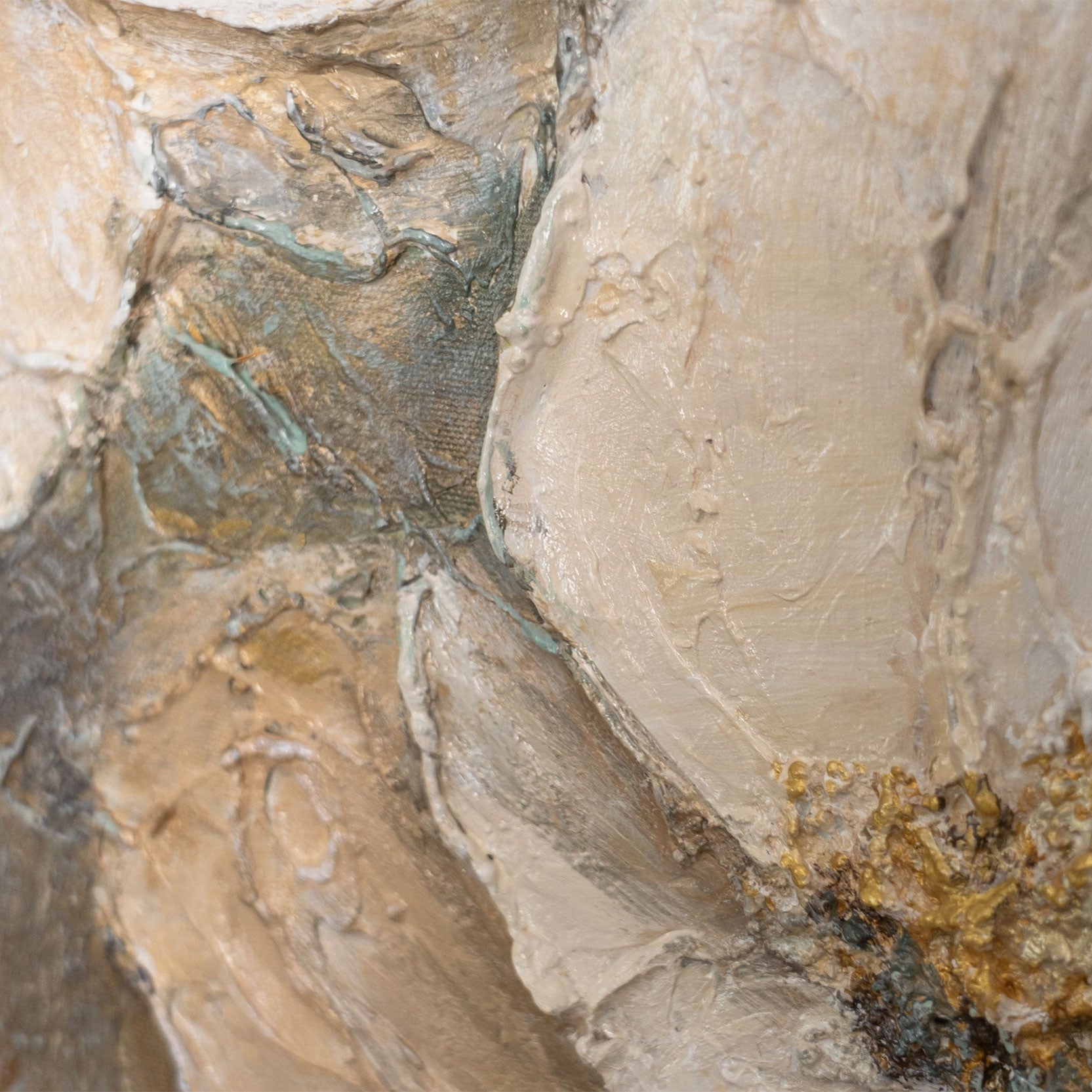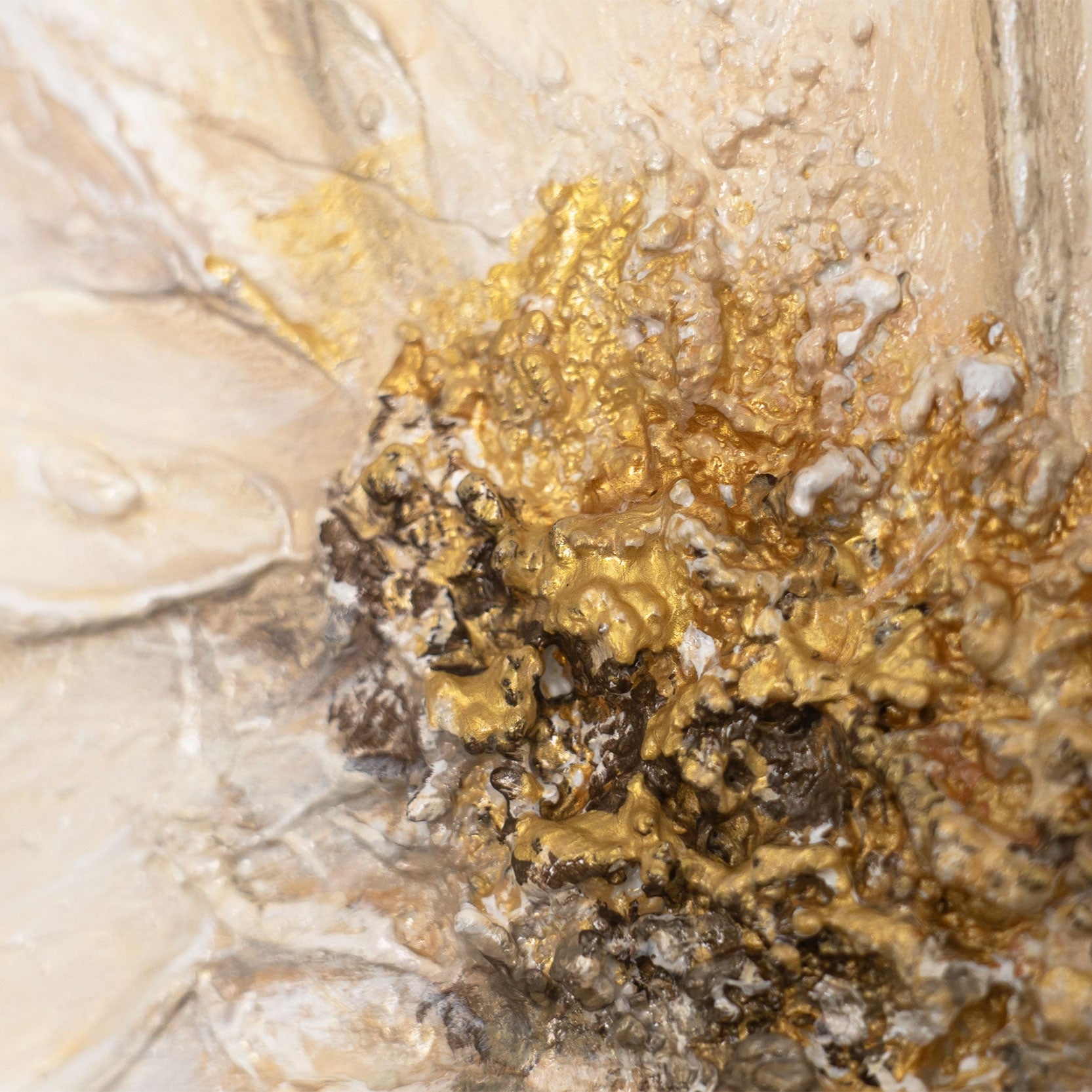 „Hellyyden huntu“ on käsinmaalattu akryylimaalaus, joka hurmaa hennon valkoisilla kukilla lämpimällä, beigellä taustalla. Terälehdet saavat kohokuvioisesta rakenteesta elävyyttä ja jalon syvyyden. Pehmeät väriliu’ut kerman, beigen ja hillittyjen kullan vivahteiden välillä antavat teokselle harmonisen ja rauhallisen ilmeen.