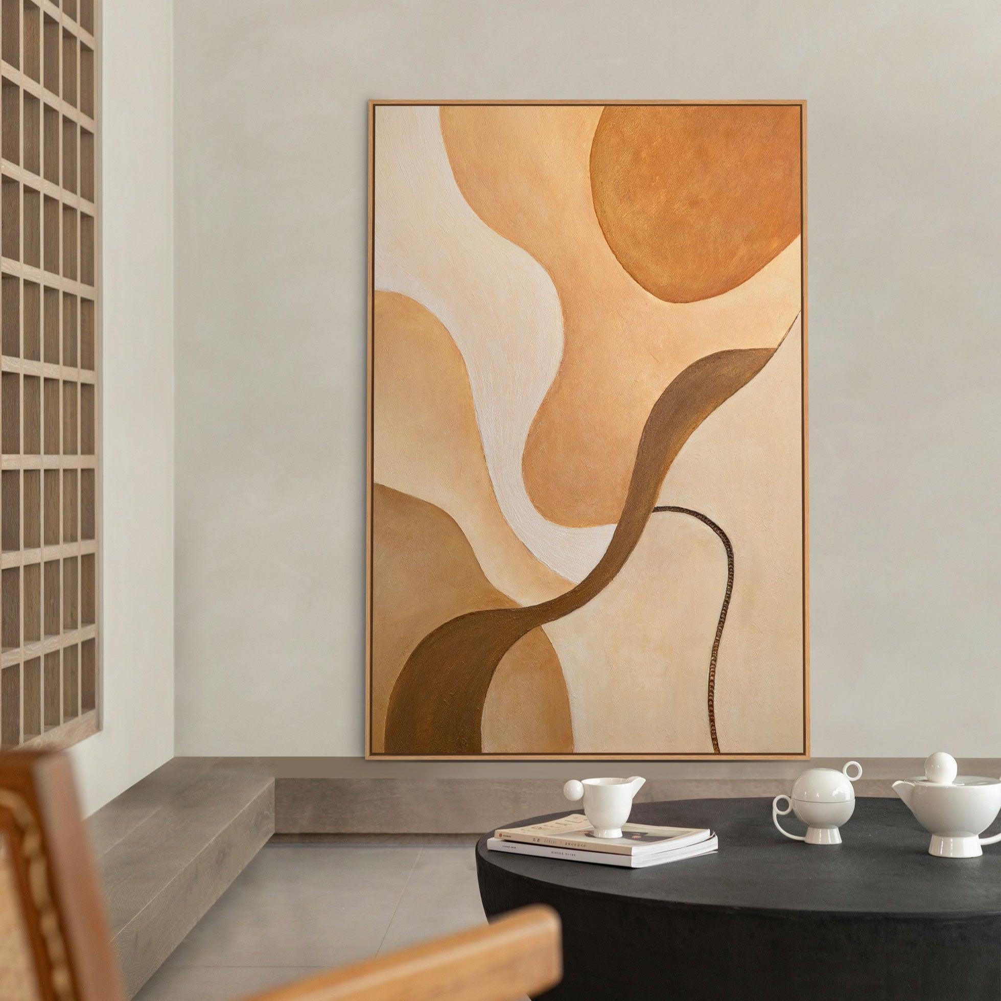 Tämä käsinmaalattu akryylimaalaus kankaalle sopii täydellisesti moderniin, minimalistiseen sisustukseen. Se yhdistää orgaaniset muodot ja ajattoman eleganssin, tuoden kotiin lämpimän ja tasapainoisen tunnelman. Ihanteellinen seinätaide olohuoneeseen tai toimistoon – ilmainen toimitus ja turvallinen pakkaus sisältyvät hintaan.