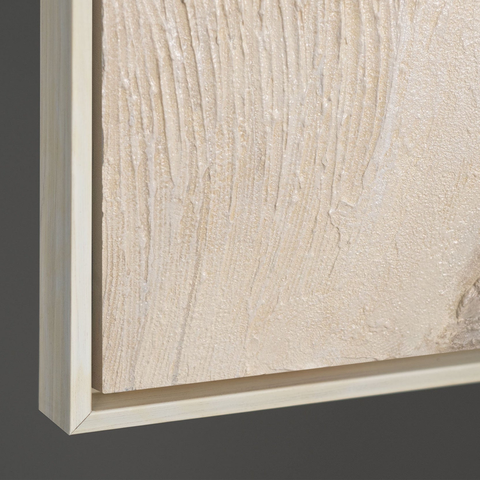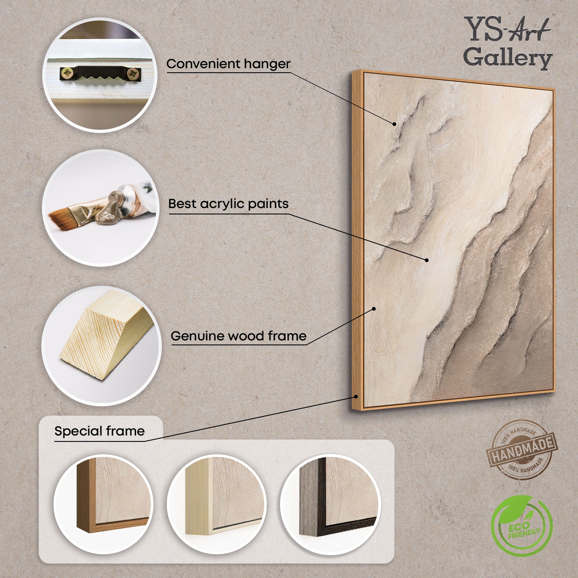 „Ajan jäljet“ on käsinmaalattu akryylimaalaus, joka hurmaa pehmeillä linjoillaan ja harmonisilla rakenteillaan. Beige-, hiekan- ja luonnonsävyinen väripaletti välittää rauhaa ja ajattomuutta, kun taas reliefimäinen pinta korostaa teoksen syvyyttä ja luonnollisuutta. Jokainen hienovarainen linja muistuttaa geologisista kerroksista ja luo orgaanisen, lähes meditatiivisen vaikutelman.