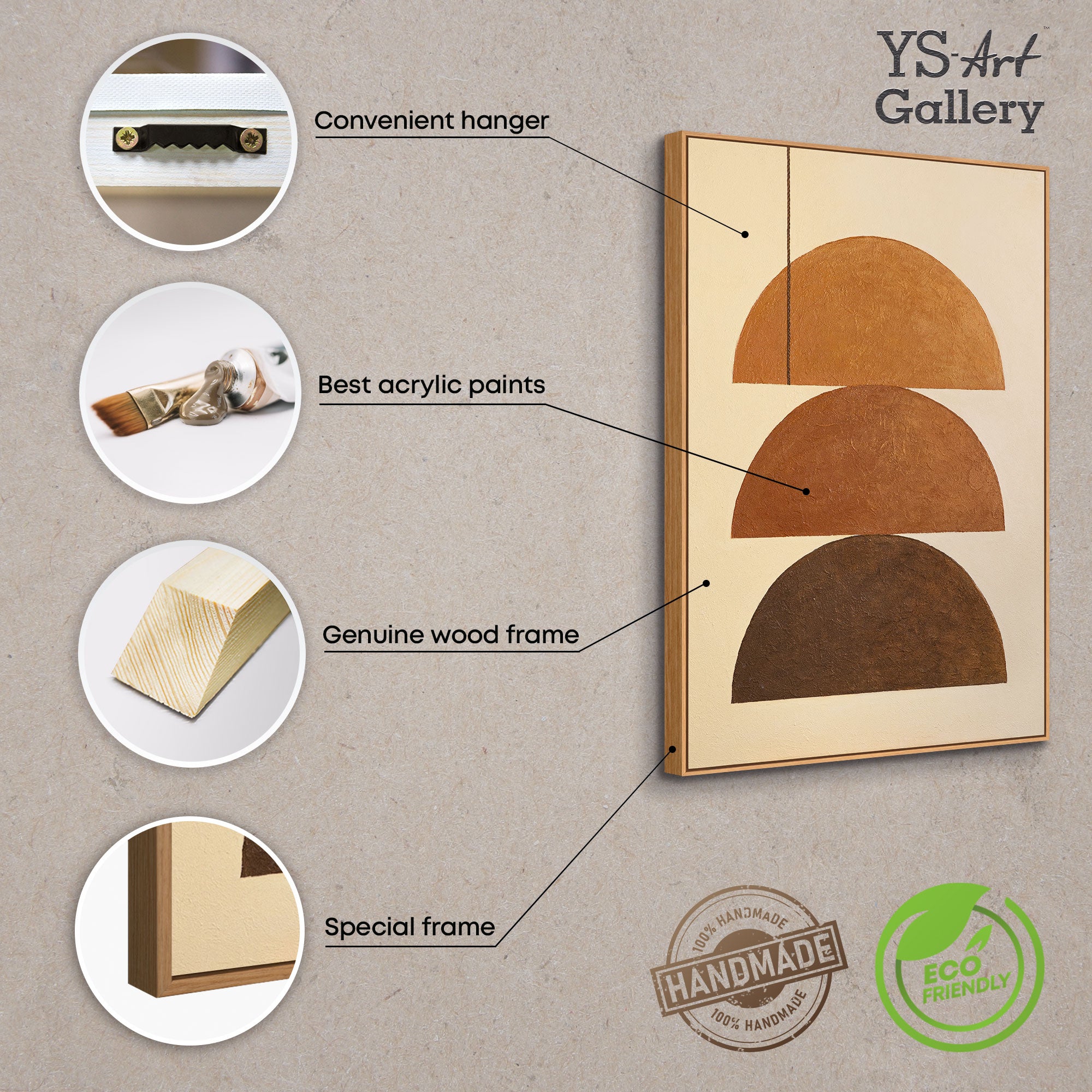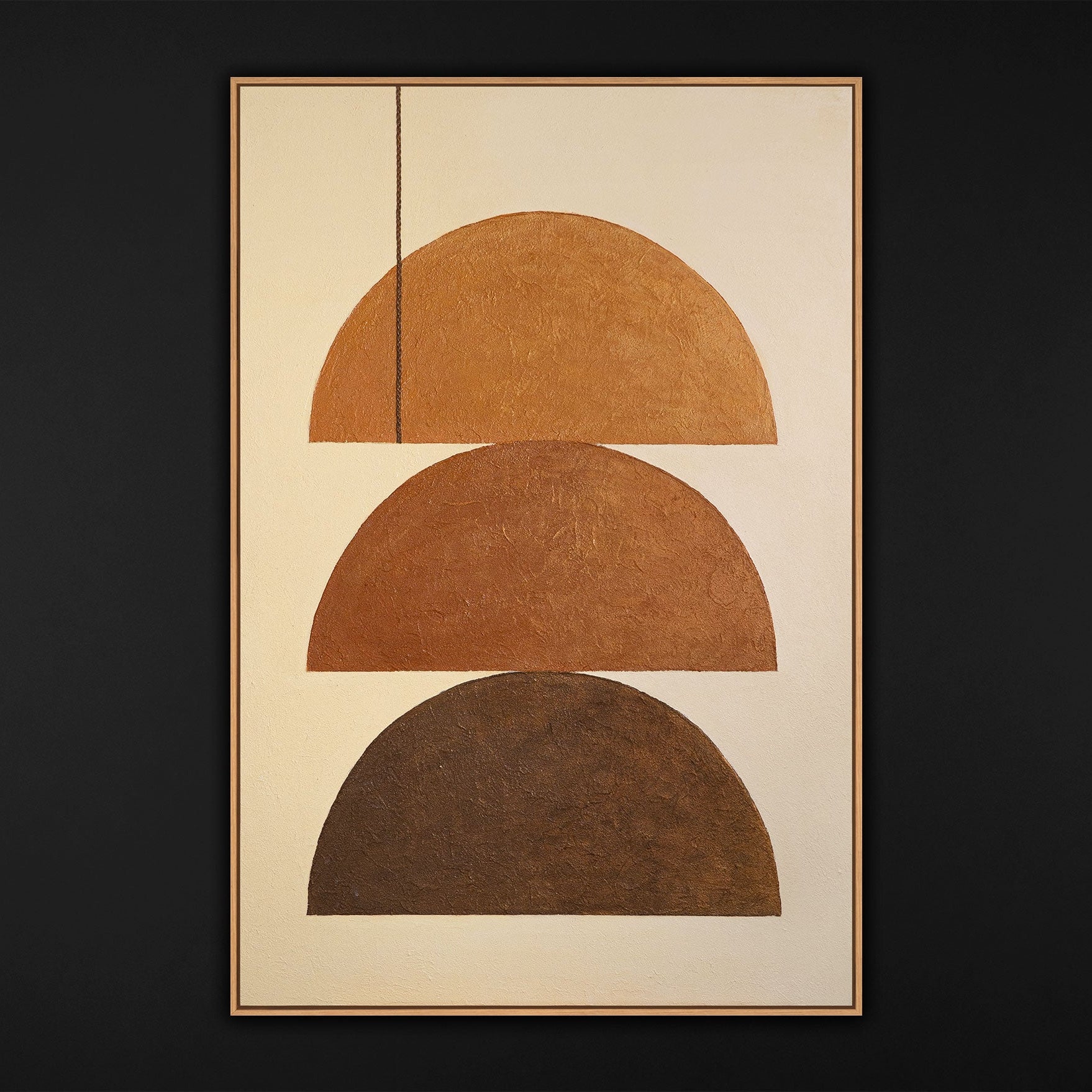 „Kolme horisonttia“ on moderni, käsinmaalattu akryylimaalaus, joka ihastuttaa selkeillä geometrisilla muodoillaan ja harmonisilla värisävyillään. Kolme puolipyöreää, lämpimissä maa- ja ruskeansävyissä, on aseteltu päällekkäin luoden minimalistisen mutta samalla voimakkaan sommitelman. Rakenteinen pinta korostaa teoksen syvyyttä ja antaa väreille erityistä elävyyttä.