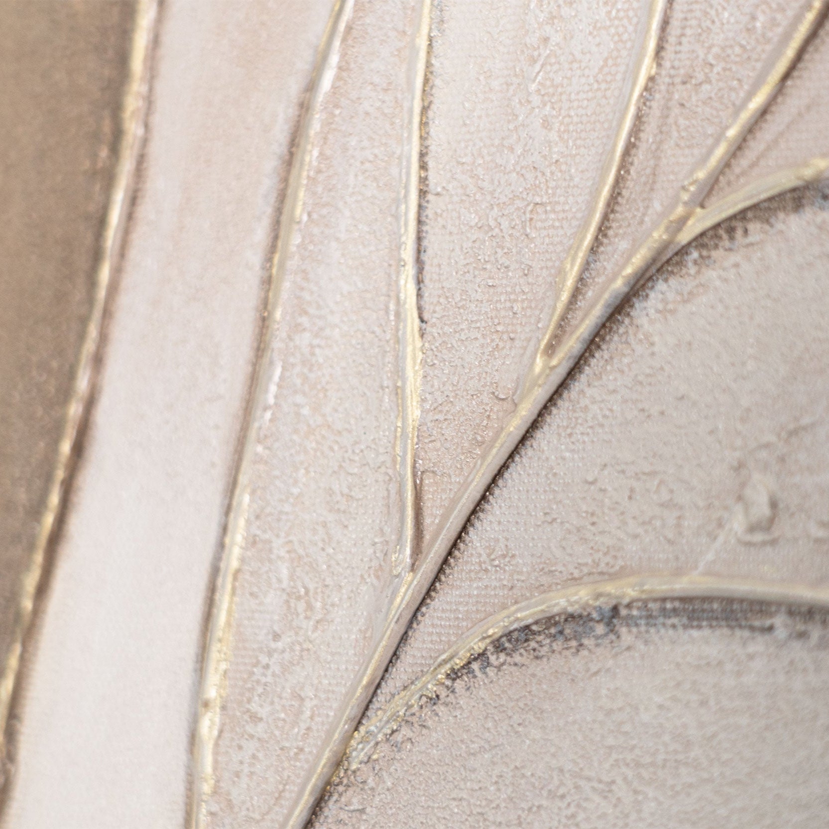 „Tuuli lehdissä“ vangitsee luonnon liikkeen hienovaraisessa rakenteessa. Pehmeästi kaartuvat lehdenmuodot sulautuvat toisiinsa harmonisissa beigen sävyissä ja luovat rauhallisen, elegantin kokonaisuuden. Kulta- ja ruskeasävyt antavat teokselle syvyyttä ja keveyttä – kuin tuulen henkäys kankaalla.