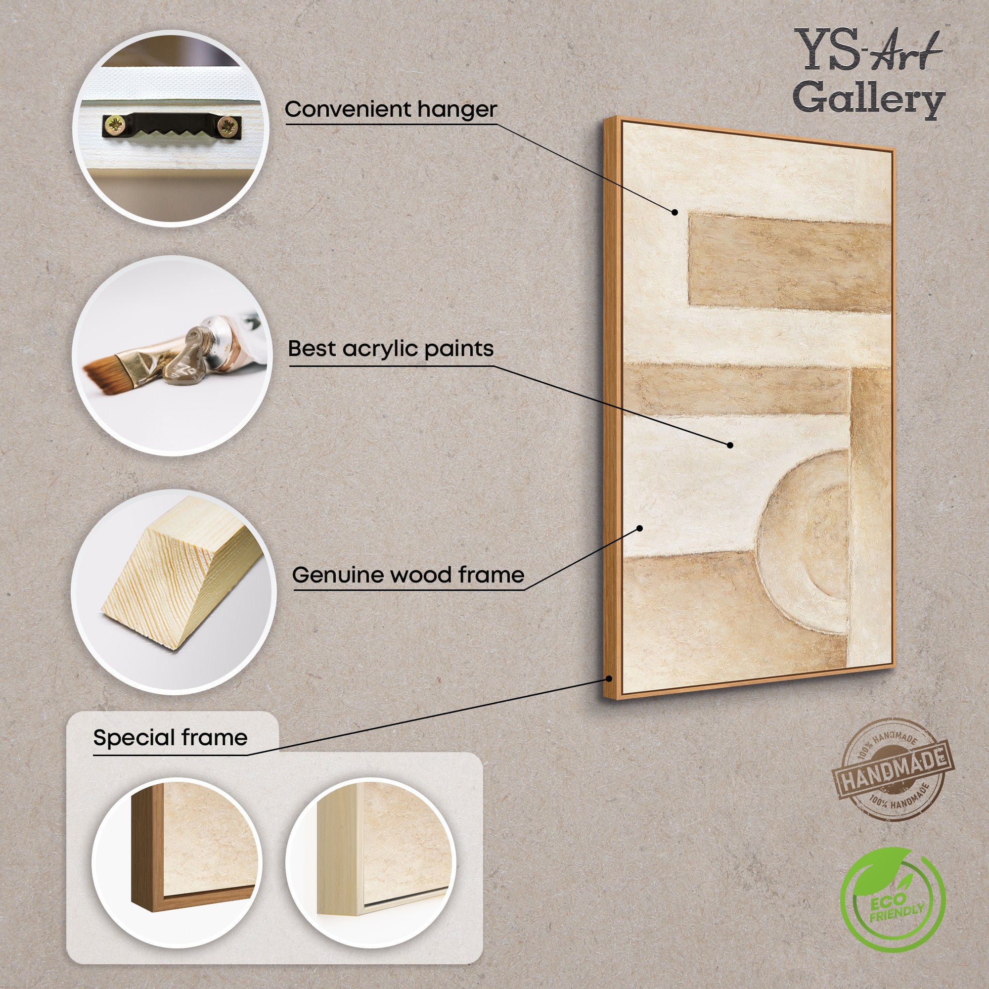 "Espacio de Formas" es una pintura abstracta minimalista que utiliza líneas limpias, transiciones suaves y tranquilos tonos naturales. Los tonos beige, crema y arena crean una composición equilibrada de elementos geométricos y formas delicadamente redondeadas. La superficie texturizada le otorga profundidad y una sutil presencia material.