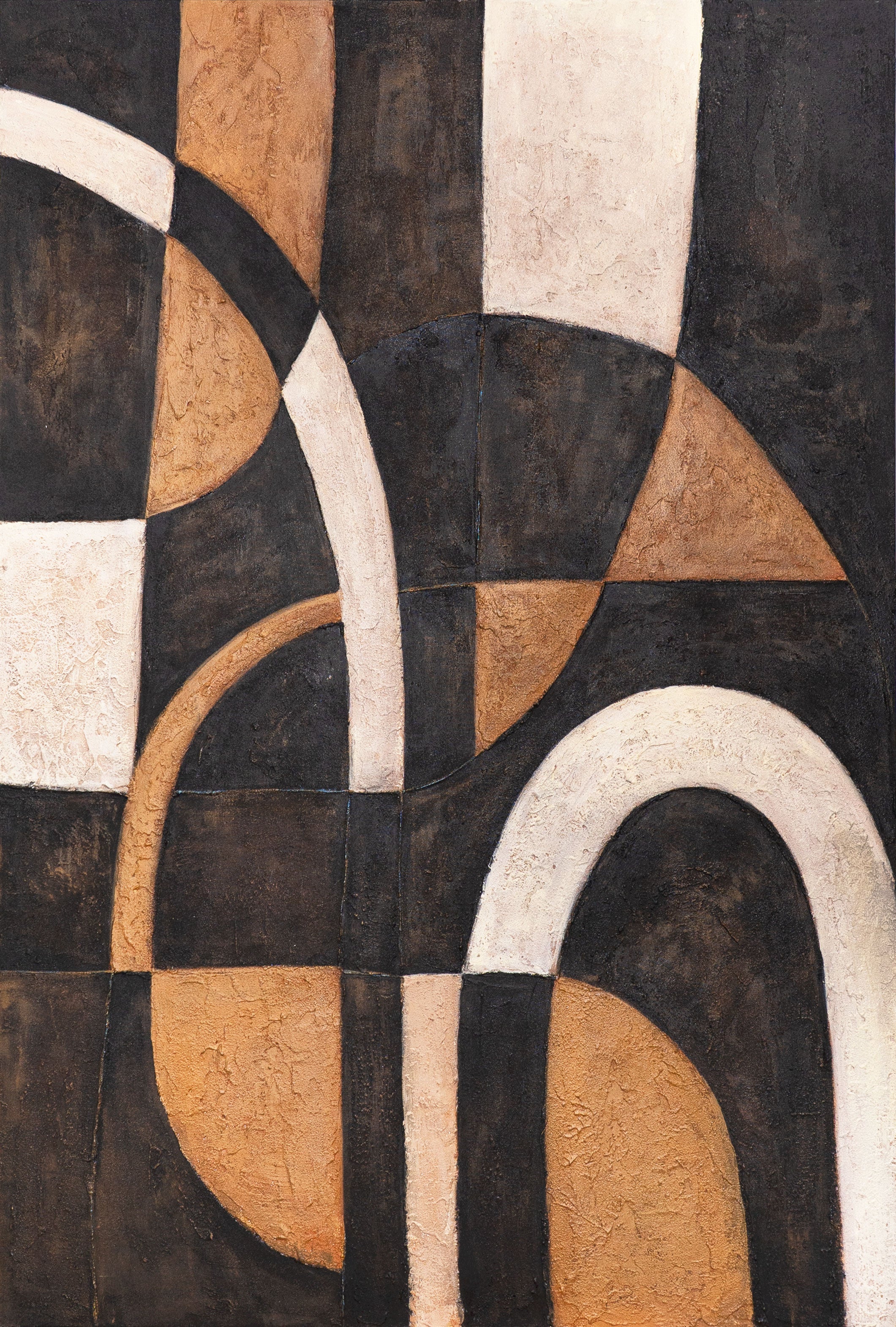 Tämä käsinmaalattu canvas taulu kiehtoo kaarevien linjojen ja geometrisen sommittelun leikillä. Lämpimän ruskean, hienostuneen beigen ja syvän mustan yhdistelmä luo harmonisen kontrastin. Rakenteellinen pinta antaa maalaukselle syvyyttä ja luonnetta, tehden siitä todellisen katseenvangitsijan.