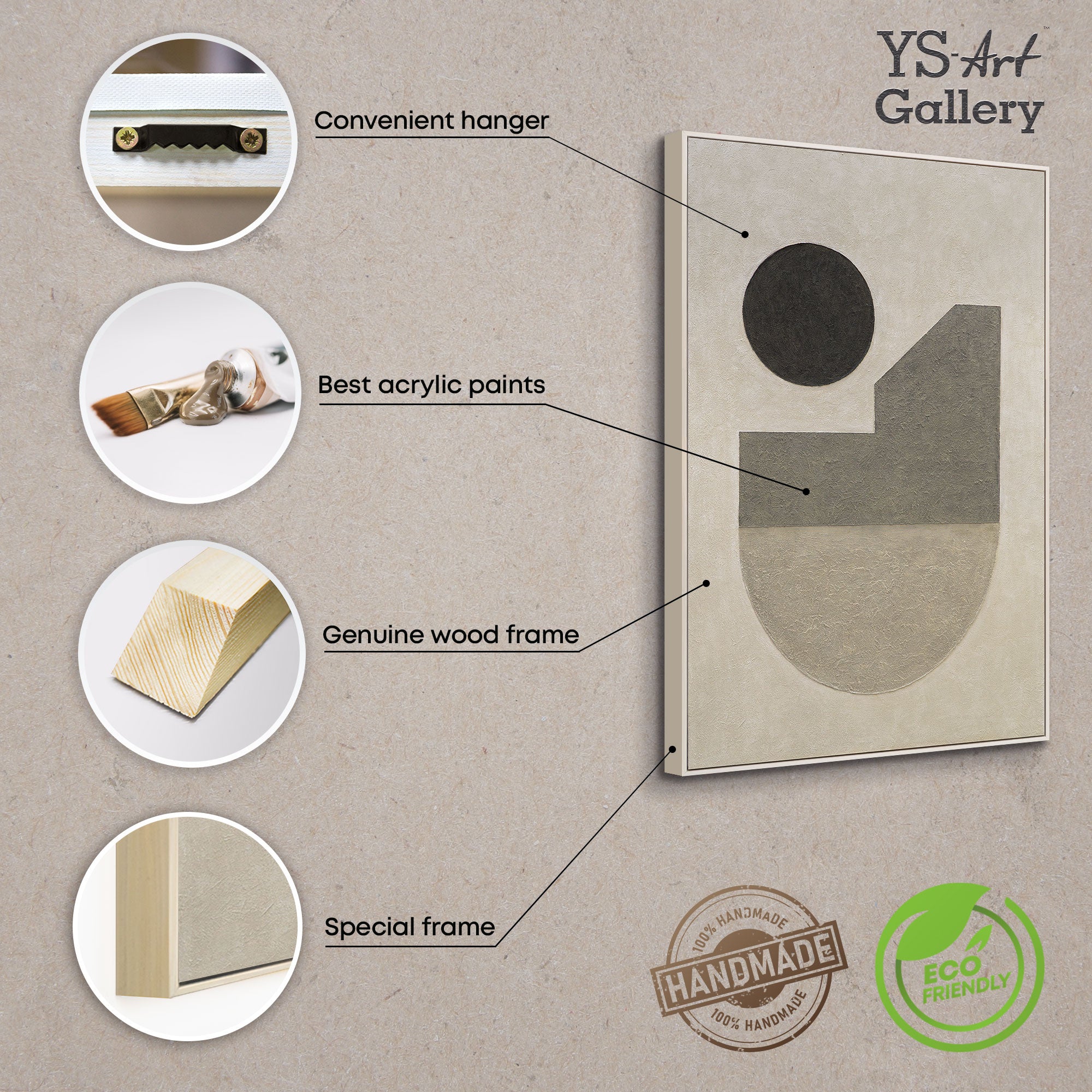 „Stille der Geometrie“ ist ein Kunstwerk der Balance und Reduktion. Schlichte geometrische Formen – Kreis, Rechteck und Halbfläche – treffen auf feine Struktur und harmonische Farbtöne aus Grau und Beige. Diese Komposition vermittelt Ruhe, Präzision und die stille Eleganz minimalistischer Gestaltung.