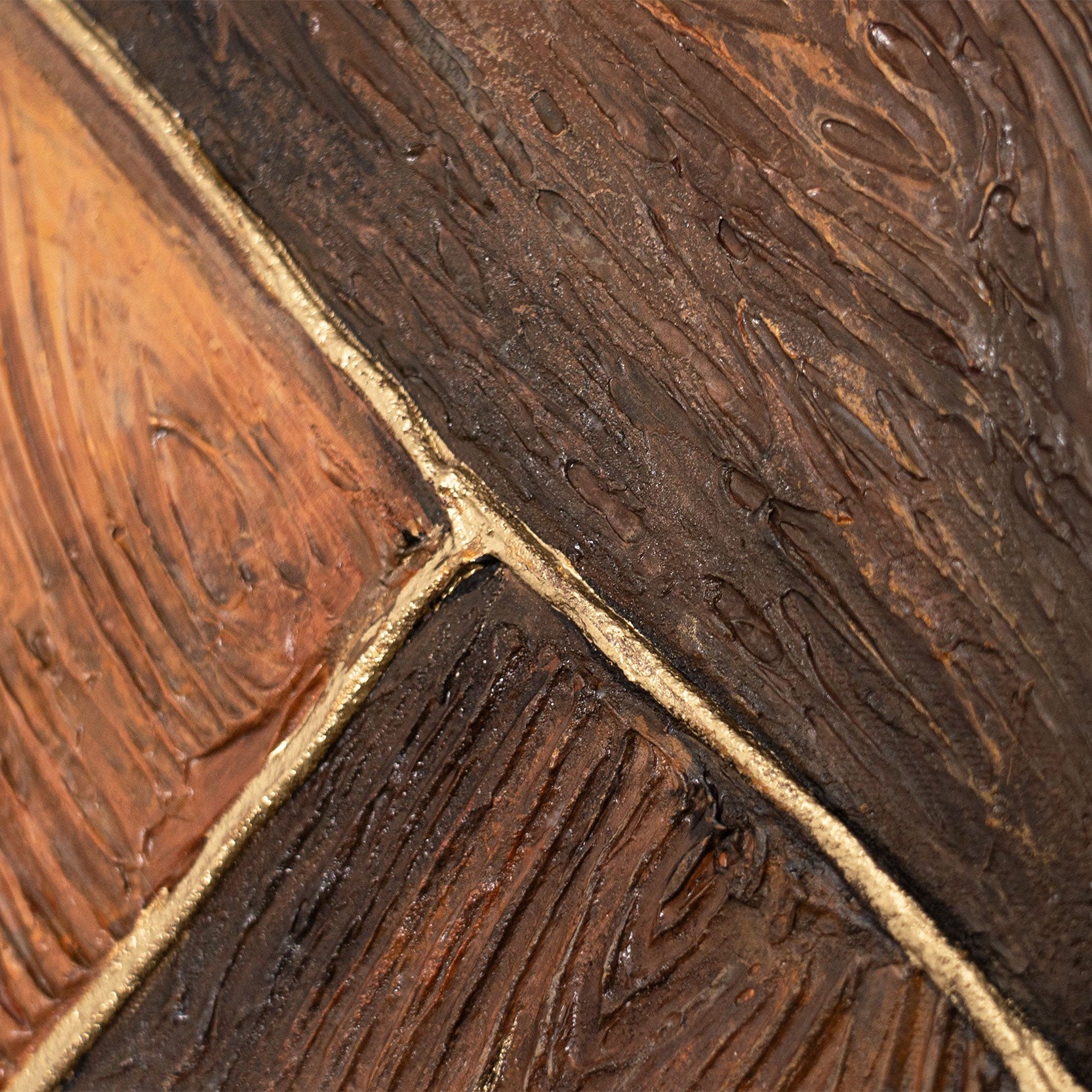 „Geometrie des Goldes“ ist ein handgemaltes abstraktes Acrylbild mit klarer, geometrischer Komposition. Unterschiedliche Flächen und Richtungen verbinden sich zu einem harmonischen Gefüge aus warmen Braun-, Holz- und Goldtönen. Die reliefartige Struktur mit sichtbaren Linien und Texturen verleiht dem Werk eine kraftvolle, architektonische Tiefe.