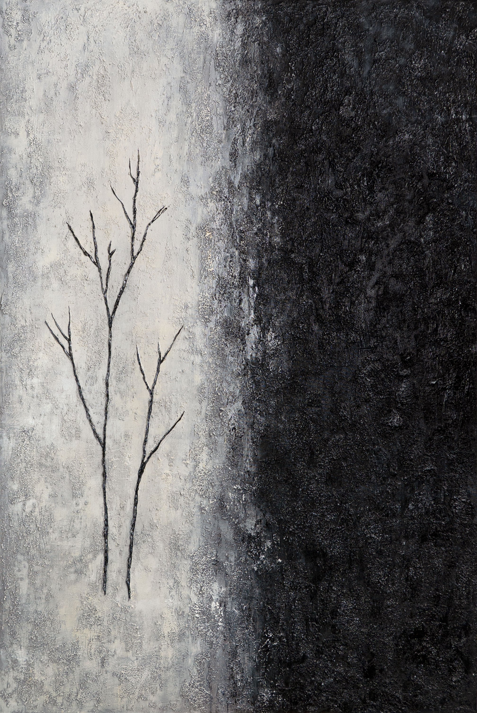 „Atem des Winters“ vereint Stille und Tiefe. Ein einzelner Baum erhebt sich zwischen hell und dunkel, als Symbol für Ruhe und Vergänglichkeit. Die kontrastreiche Farbfläche in Schwarz und Weiß verleiht dem Werk eine starke emotionale Präsenz, während die strukturierte Oberfläche das Motiv greifbar macht.