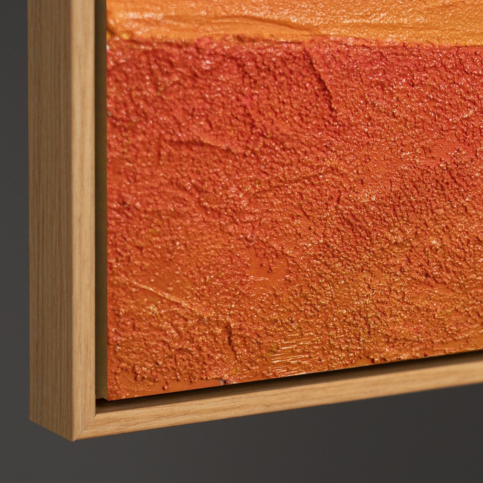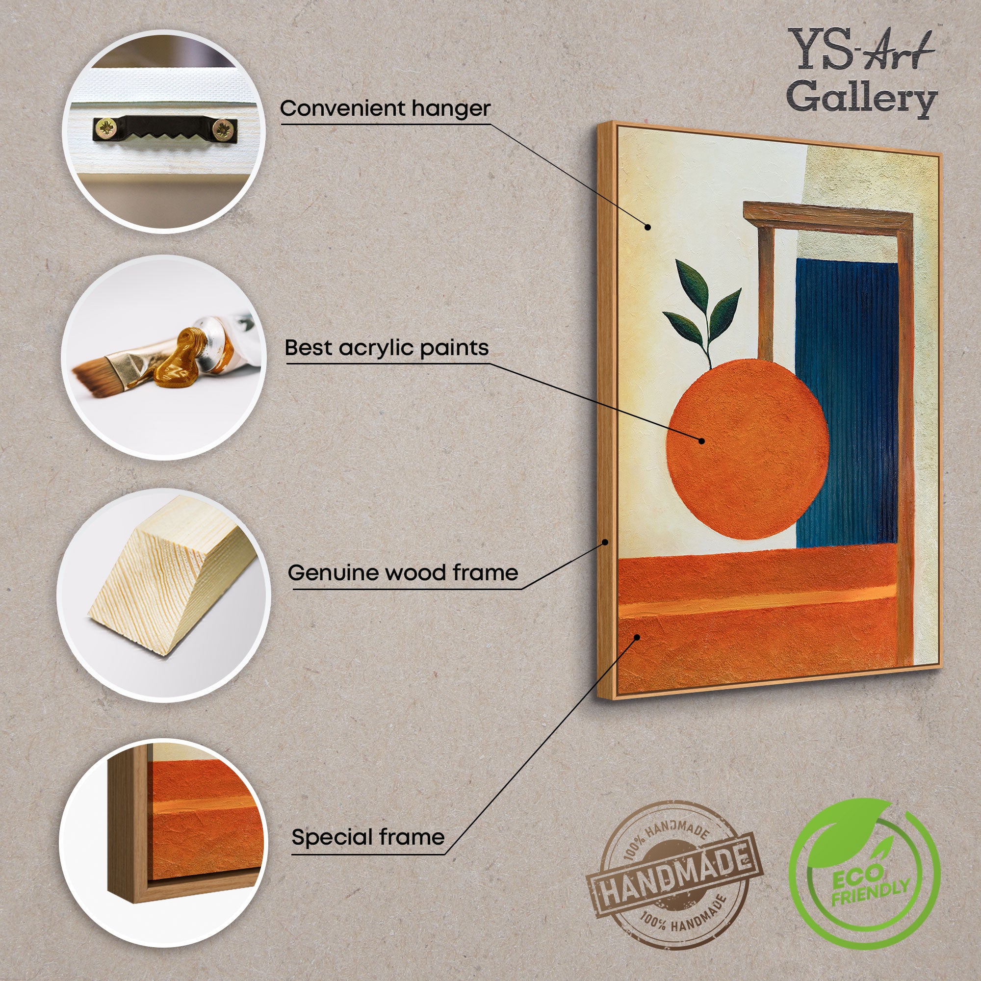 „Fruchtbare Balance“ vereint Geometrie und Natur in einer harmonischen Komposition. Die leuchtend orangefarbene Kugel steht für Energie und Leben, während klare Linien und natürliche Texturen Stabilität und Ruhe schaffen. Akzente in tiefem Blau und warmem Ocker verleihen dem Werk Tiefe und Ausdruck.