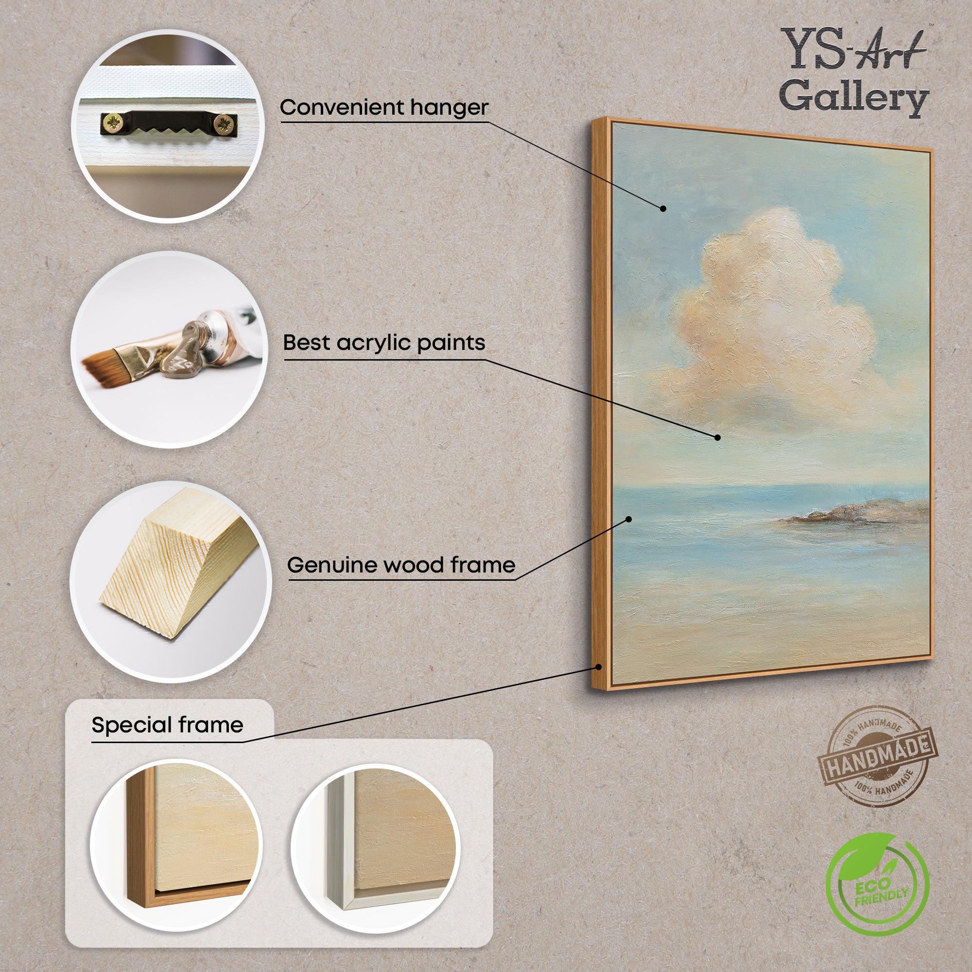 „Leichtigkeit des Seins“ verkörpert den Moment der vollkommenen Ruhe. Eine weiche Wolkenformation schwebt über dem zarten Blau des Meeres, während feine Strukturen und Pastelltöne von Beige und Creme das Licht sanft reflektieren. Die handgemalte Oberfläche lässt das Bild lebendig wirken und füllt den Raum mit friedlicher Energie.