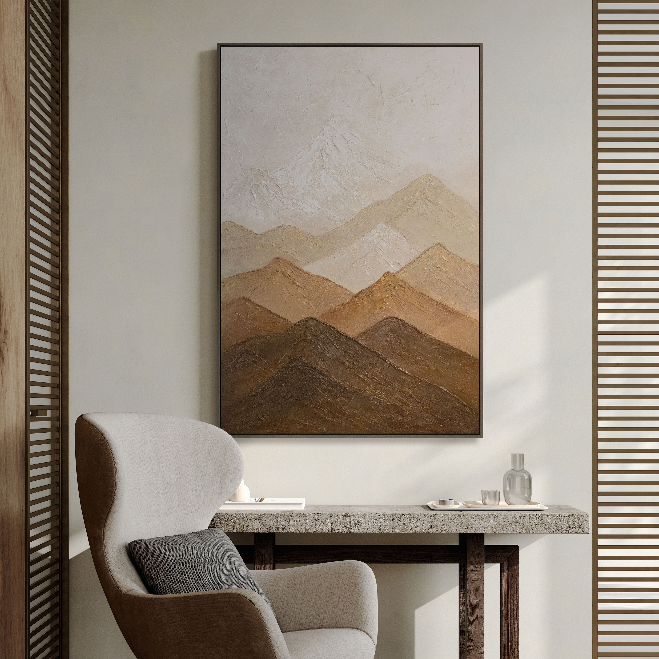 „Kerrostumien harmonia“ on käsinmaalattu akryylimaalaus, joka vangitsee maakerrosten kauneuden abstraktissa muodossa. Pehmeät beigen, hiekan ja ruskean sävyt luovat rauhan ja tasapainon tunnetta, kun taas rakenteellinen pinta antaa teokselle syvyyttä ja luonnollisuutta. Jokainen kerros on kuin hiljainen luonnon kaiku, joka tuo orgaanista harmoniaa tilaan.