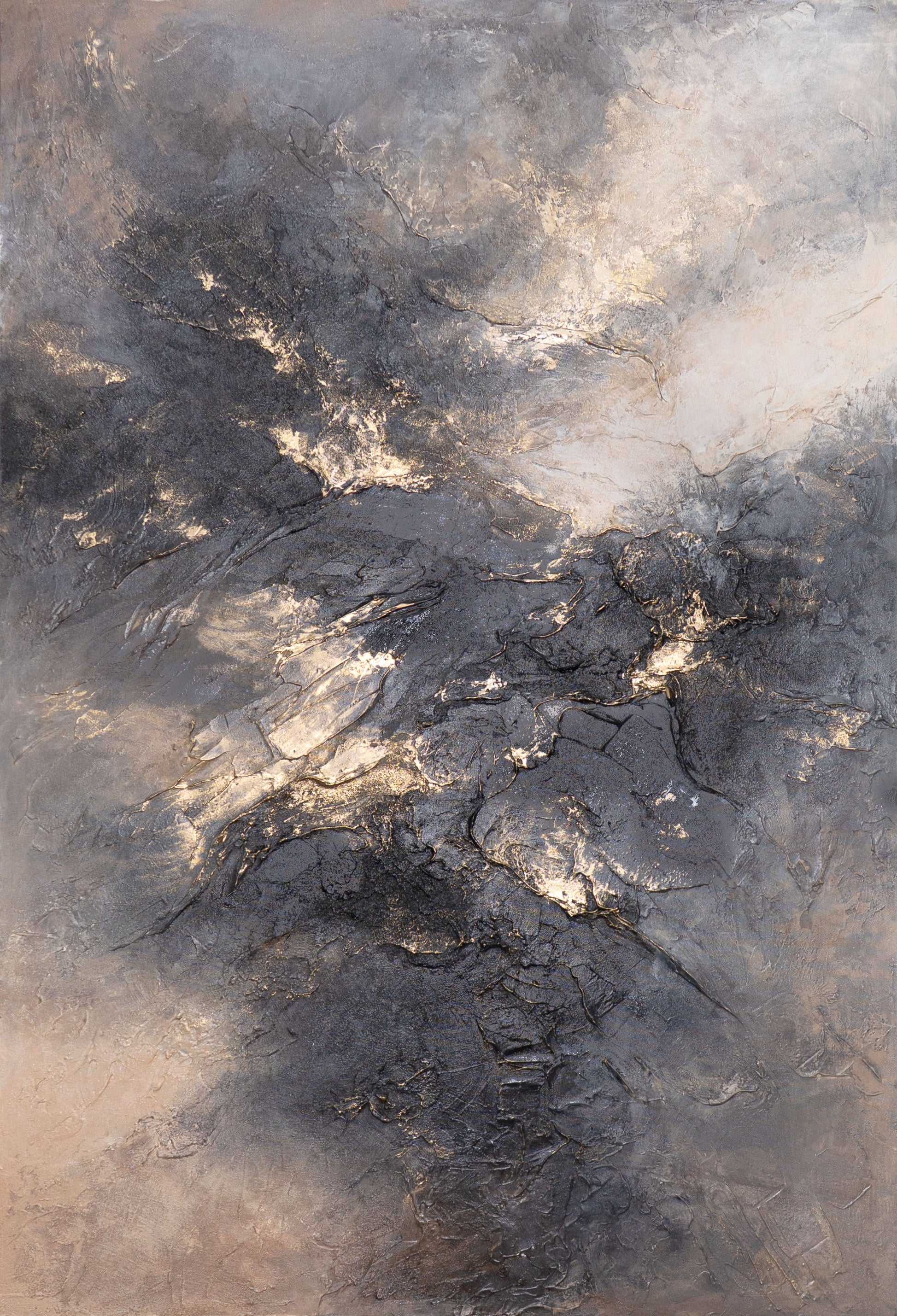 Anna kodillesi voimakas ilme käsinmaalatun canvas taulu „Taivaan hehku“ avulla. Tummat harmaan sävyt sulautuvat pehmeisiin beigeen vivahteisiin, samalla kun kultaiset yksityiskohdat murtavat pilvien läpi kuin loistavat säteet. Rakenteellinen pinta luo kiehtovaa syvyyttä ja dynamiikkaa, joka tekee teoksesta ainutlaatuisen.