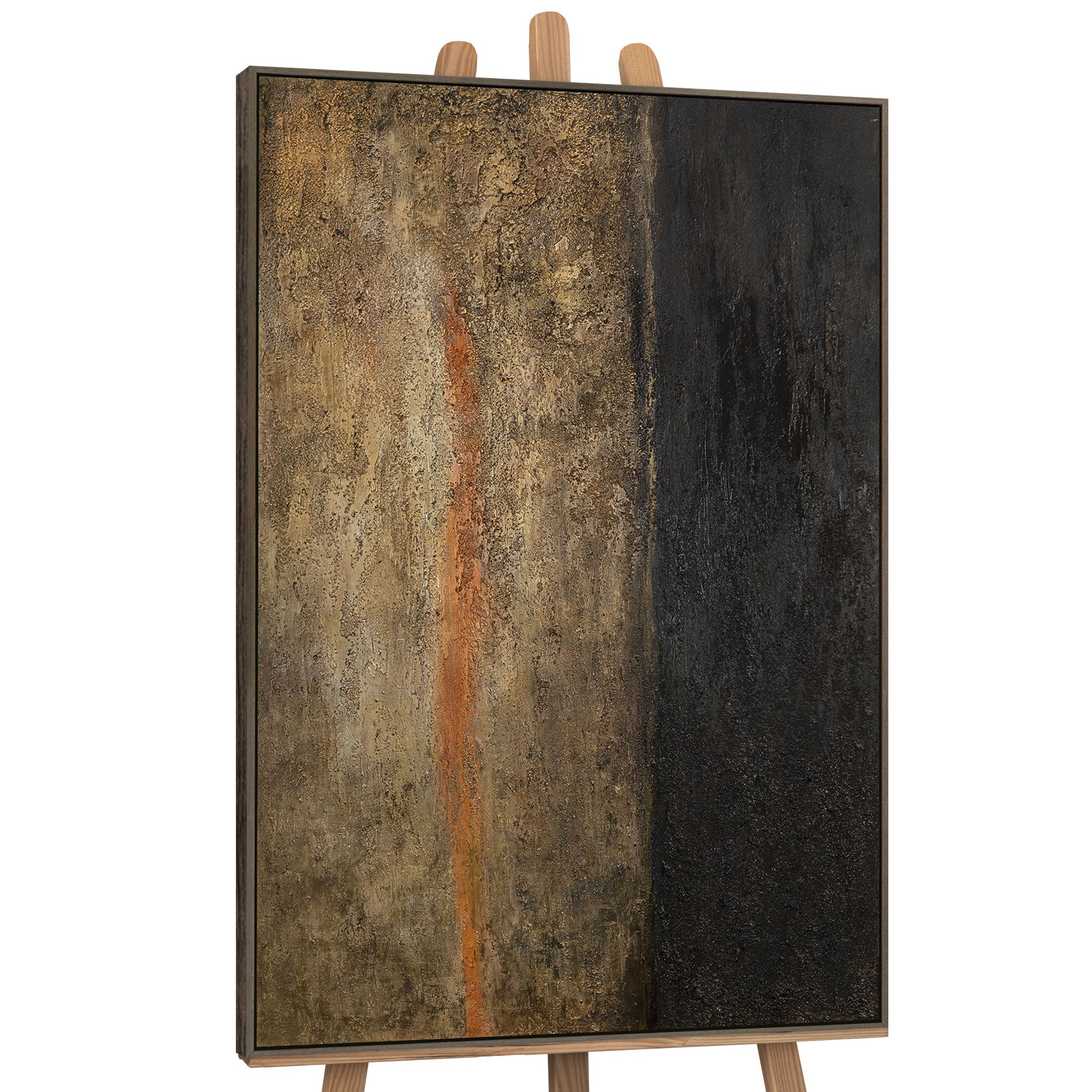 „Ajan syvyys“ on voimakas, käsinmaalattu akryylimaalaus, joka hurmaa kontrastikkaalla värimaailmallaan ja intensiivisellä rakenteellaan. Syvä musta, lämpimät ruskean sävyt, jalokultainen kiilto ja hienovarainen punainen aksentti luovat mystisen ja samalla elegantin vaikutelman. Reliefimäinen pinta tuo teokseen syvyyttä ja voimaa.