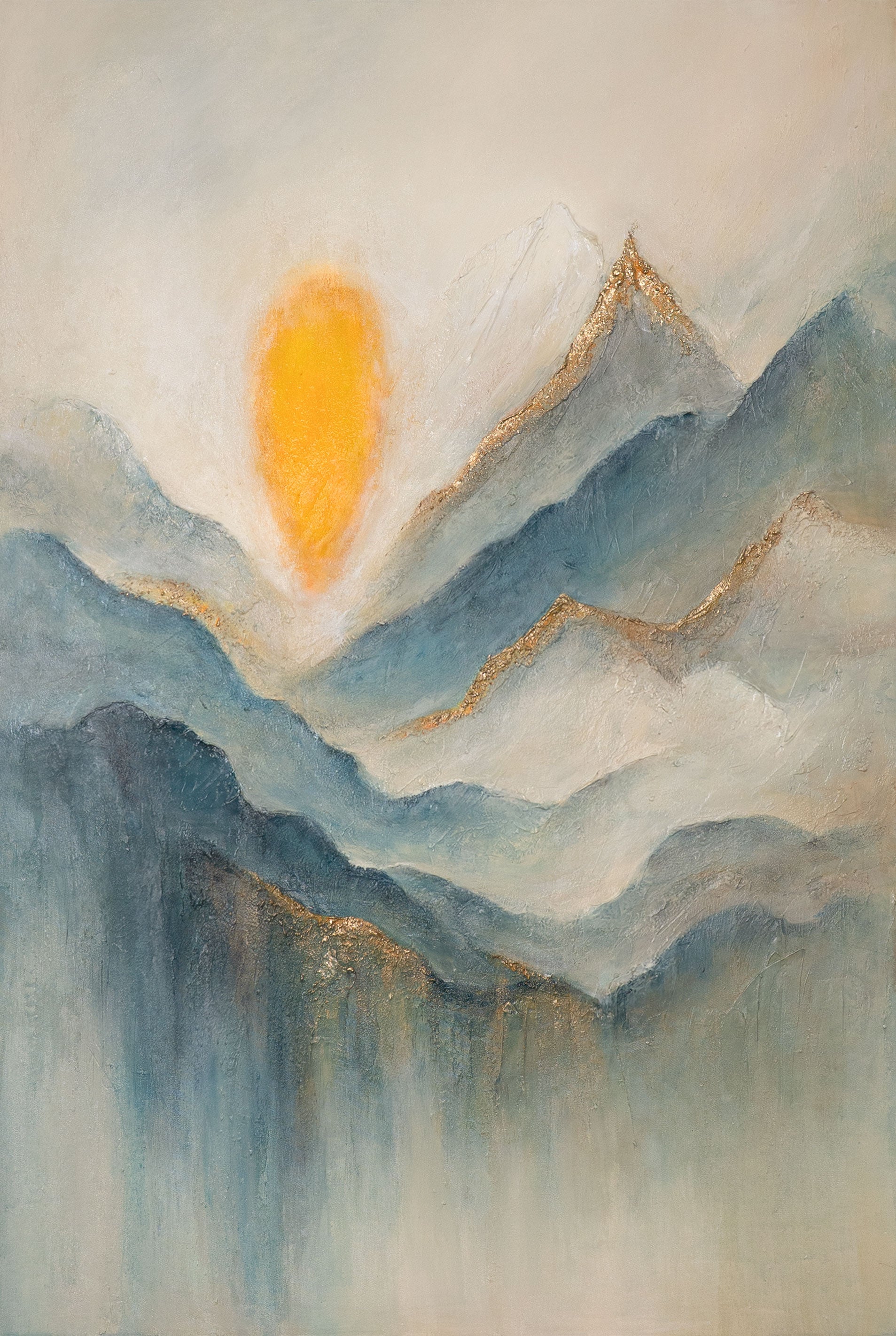 "Aamunkoitto pilvissä" on kiehtova, käsinmaalattu akryylityö, joka hurmaa loistavan kullan ja pehmeiden sinisten sävyjen yhdistelmällä. Dynaamiset siveltimenvedot antavat vuorille ja pilville erityistä syvyyttä, ja kultaiset korostukset tuovat auringonnousun vaikuttavasti esiin. Rakenteellinen pinta korostaa aiheen elävyyttä ja tekee tästä abstrakti maalaus -teoksesta katseenvangitsijan, jolla on voimakas aura.