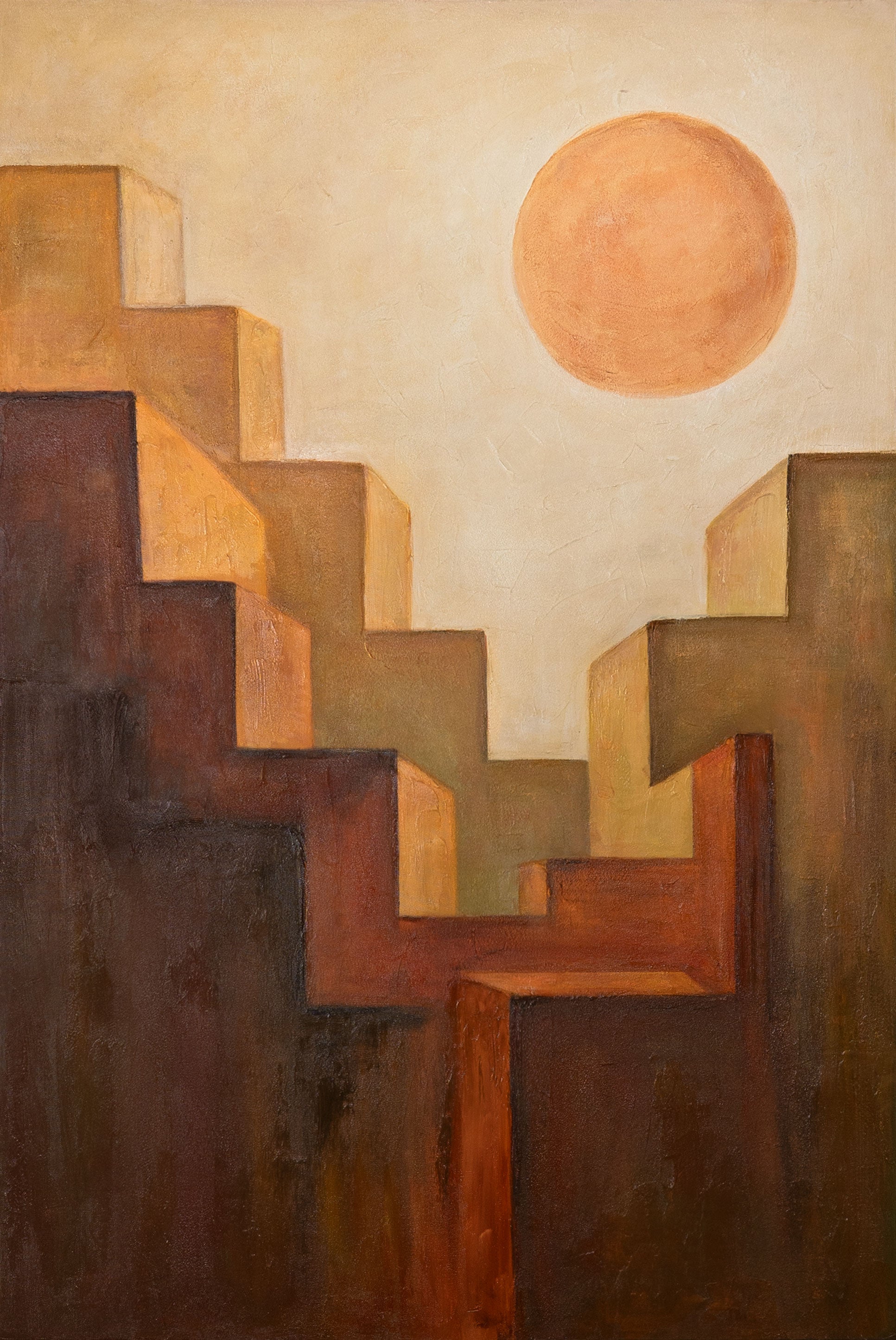 "Nousu" on käsinmaalattu akryylityö kankaalle, joka luo vaikuttavan kokonaisuuden selkeillä geometrisilla muodoilla ja lämpimillä maan sävyillä. Taustalla oleva aurinko vahvistaa voiman ja tasapainon tunnelmaa. Rakenteellinen pinta tekee teoksesta plastisen ja elävän, ja ruskean, oranssin ja beigen väripaletti tuo lämpöä ja syvyyttä.