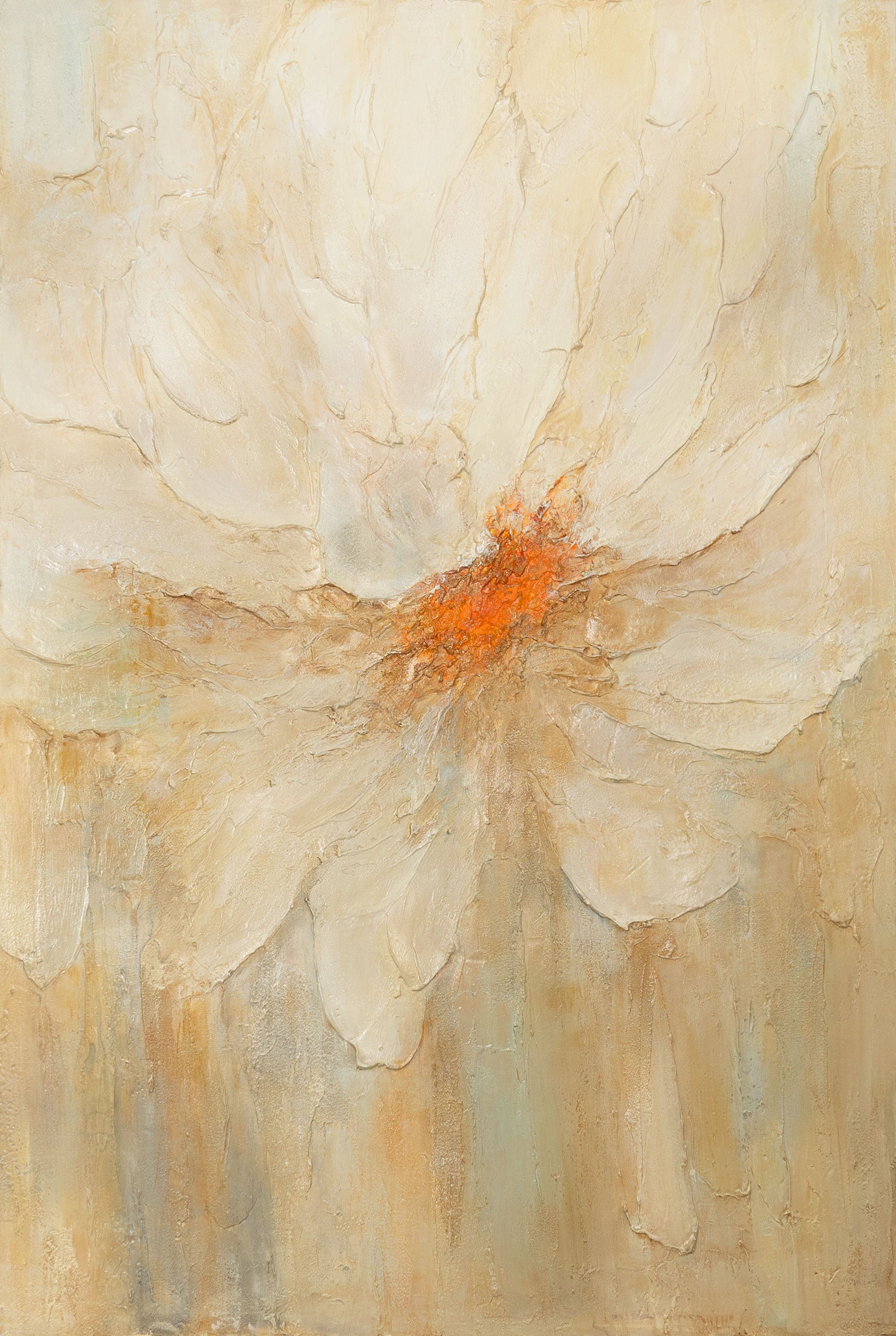 Akryylimaalaus "Tulipöly" loistaa kiehtovassa sommittelussa pehmeiden kerman sävyjen ja kirkkaan oranssin keskuksen ympärillä. Rakenteellinen pinta antaa terälehdille syvyyttä ja elävyyttä, kun taas lämpimät vivahteet luovat vaikutelman valosta ja liikkeestä.