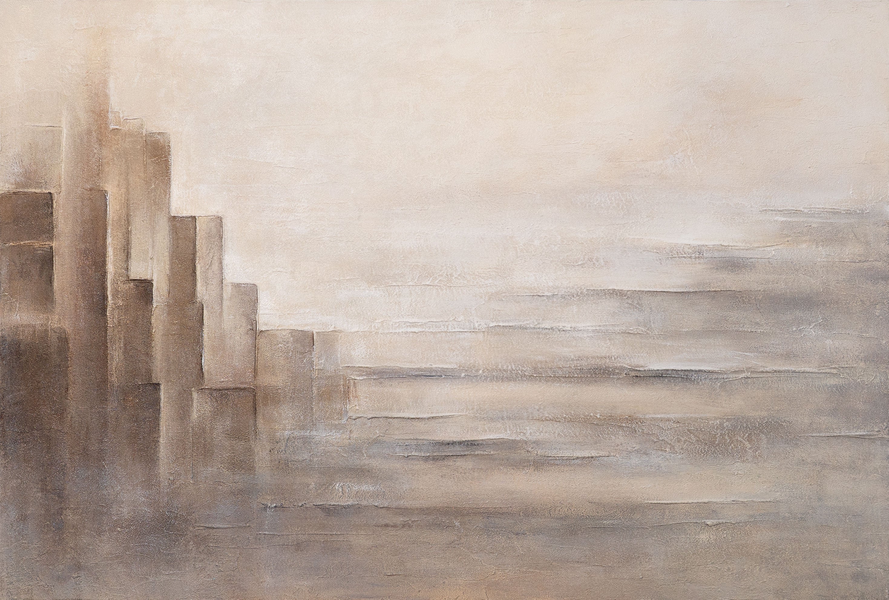 Käsinmaalattu canvas taulu "Illuusion rajat" leikittelee selkeillä rakenteilla ja pehmeillä siirtymillä. Suorakulmaiset muodot kohoavat kuin portaat ylöspäin, kun taas pehmeät beigen ja ruskean sävyt sulautuvat laajoihin pintoihin. Sommitelma tuo mieleen urbaanin maiseman, joka katoaa horisonttiin – arkkitehtuurin ja illuusion yhdistelmä.