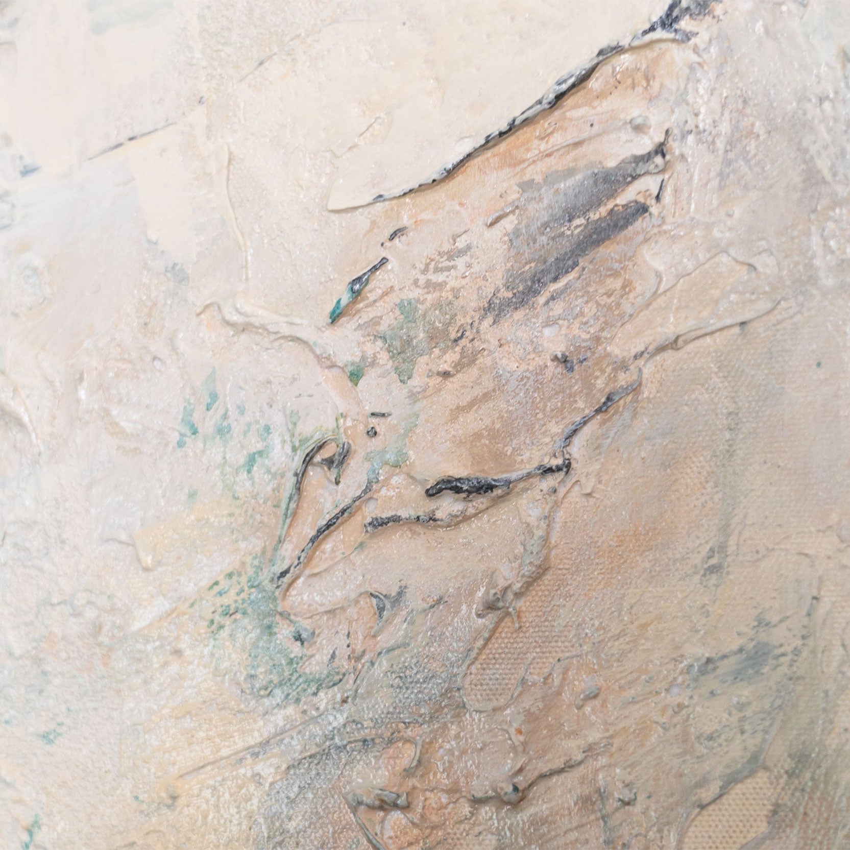„Lämmin kuiskaus“ on abstrakti, käsinmaalattu akryylimaalaus, joka hurmaa harmonisella yhdistelmällä viileitä sinisiä sävyjä, pehmeitä beigejä ja lämpimän punaista aksenttia. Reliefimäinen rakenne antaa teokselle syvyyttä ja elävyyttä, luoden kiehtovan dynamiikan tilaan.
