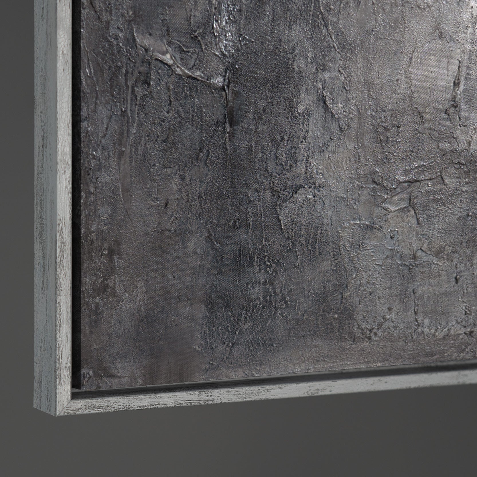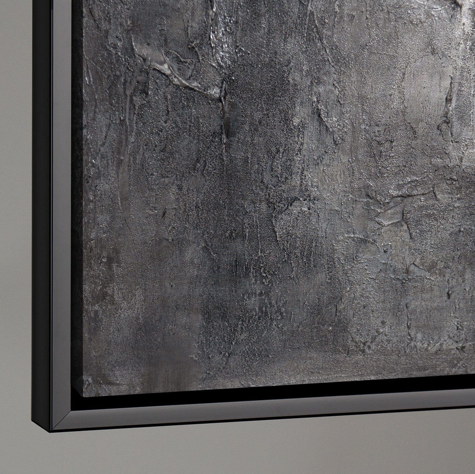 „Erinnerung des Steins“ verkörpert die stille Kraft von Zeit und Materie. In unterschiedlichen Grautönen entfalten sich raue Strukturen, die an verwitterten Stein und urbane Oberflächen erinnern. Die plastische Tiefe des handgemalten Reliefs erzeugt ein Spiel aus Licht und Schatten, das sich mit jeder Perspektive verändert.