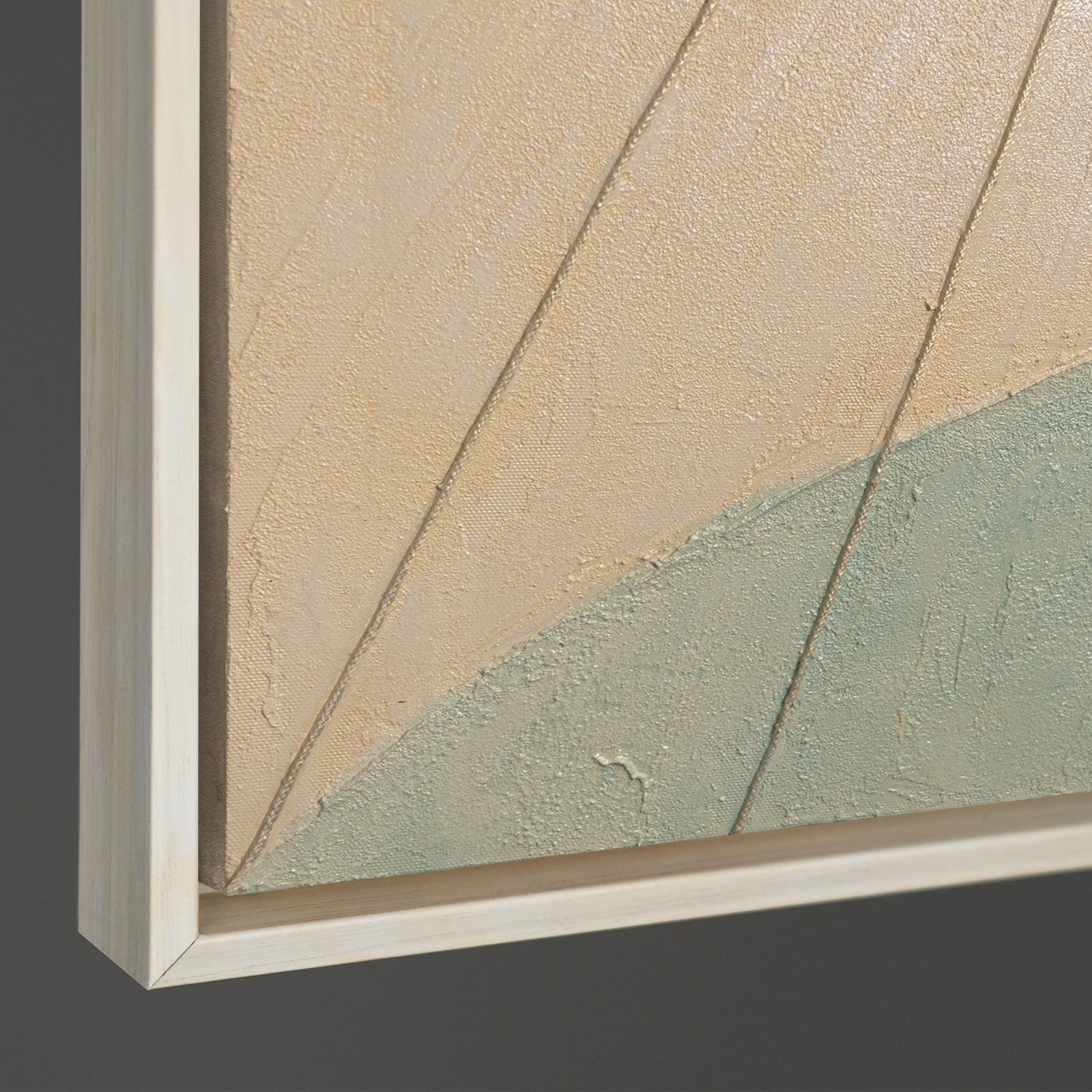 „Morgendämmerung über dem Meer“ erstrahlt in sanften, lichtdurchfluteten Farbtönen – ein Spiel aus Creme, Hellblau und Beige, das den Moment zwischen Nacht und Tag einfängt. Die feine Struktur auf der Leinwand verleiht Tiefe und Bewegung, während die zarten Linien einen meditativen Rhythmus schaffen.