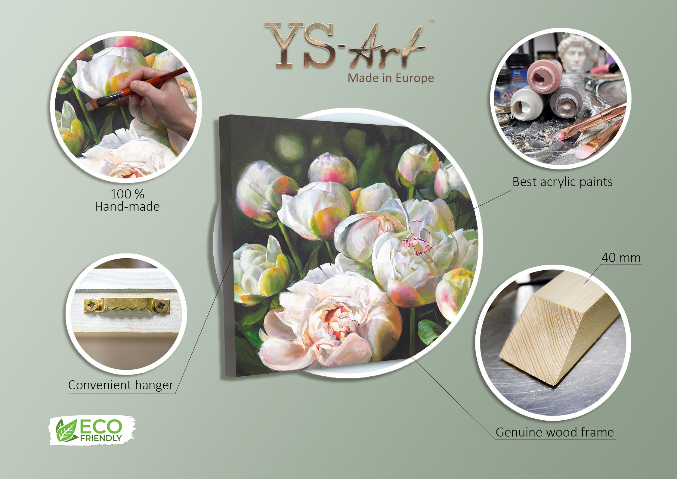 Pionit säteilevät voimakasta ja puhdasta energiaa, joka tuo hyvää onnea kotiin ja työelämään. Syvät värit ja yksityiskohtaiset terälehdet lisäävät maalauksen eksklusiivisuutta ja positiivista ilmapiiriä. Maalaus "Rikkaus" on täydellinen lisä moderniin sisustukseen, olohuoneeseen tai työtilaan.