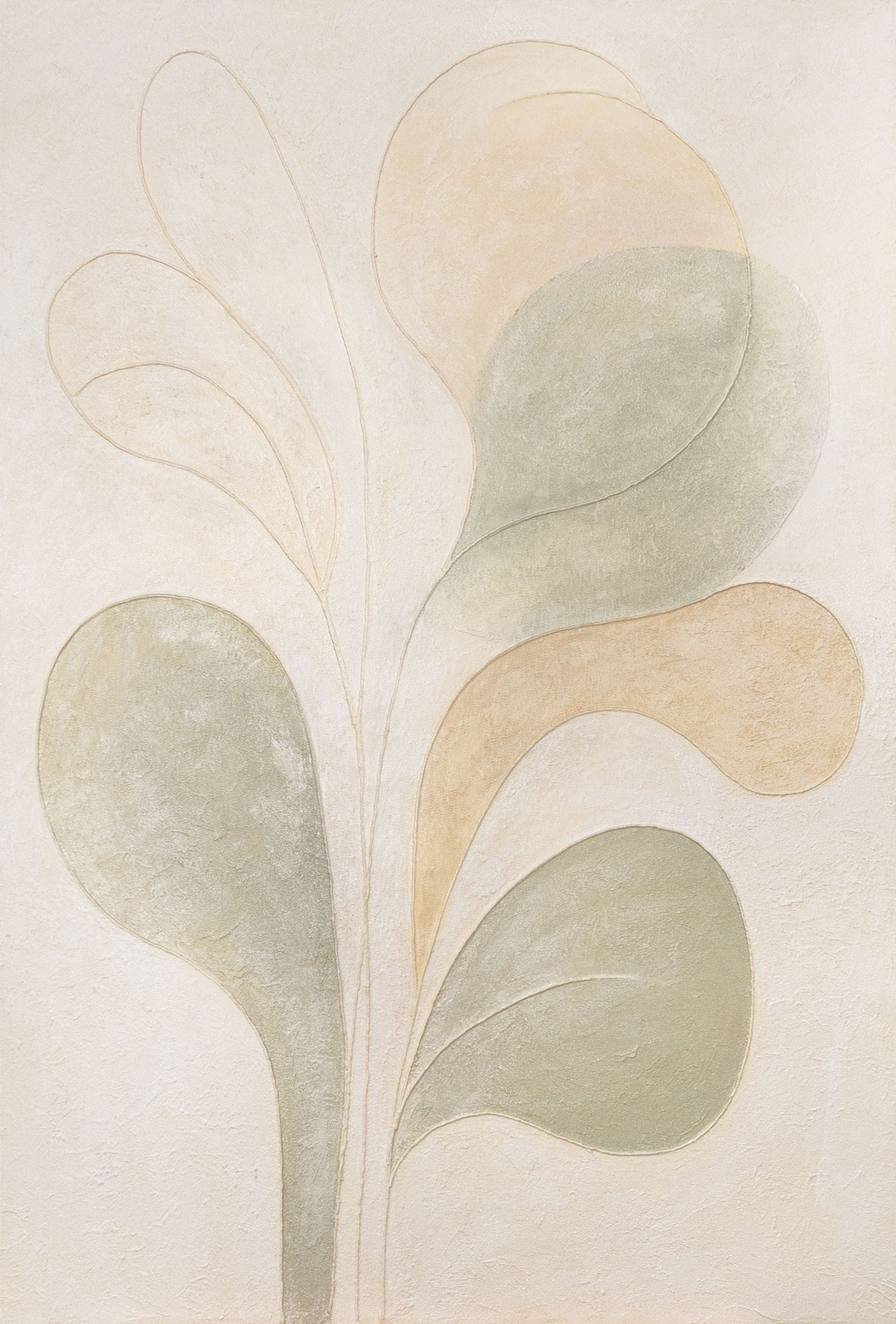 Tämä käsinmaalattu canvas taulu hurmaa orgaanisilla muodoillaan ja pehmeillä sävyillään beigessä, vihreässä ja hiekassa. Hienolla rakenteella toteutettuna teos näyttää kevyeltä, harmoniselta ja samalla elegantilta – symboli rauhalle ja luonnollisuudelle.
