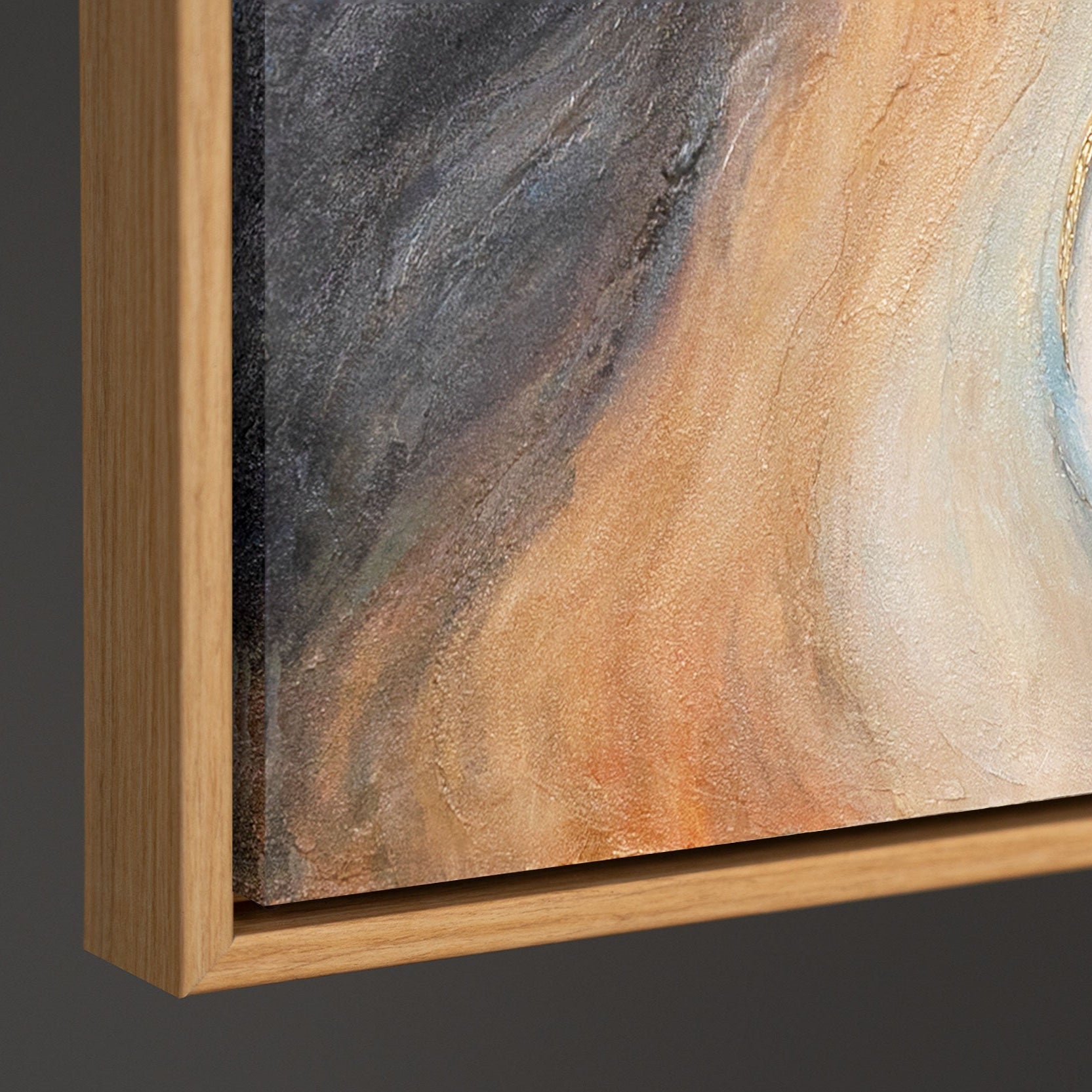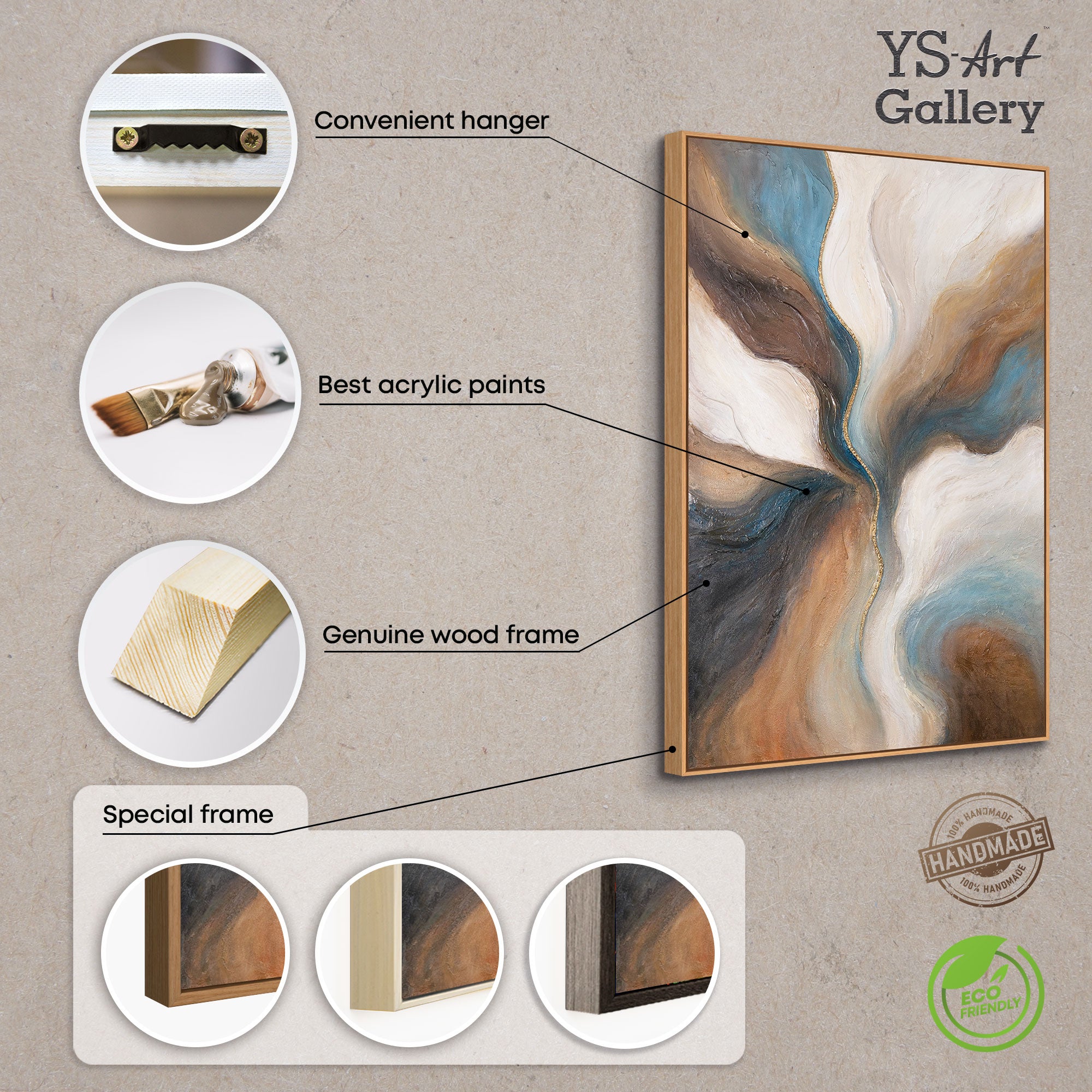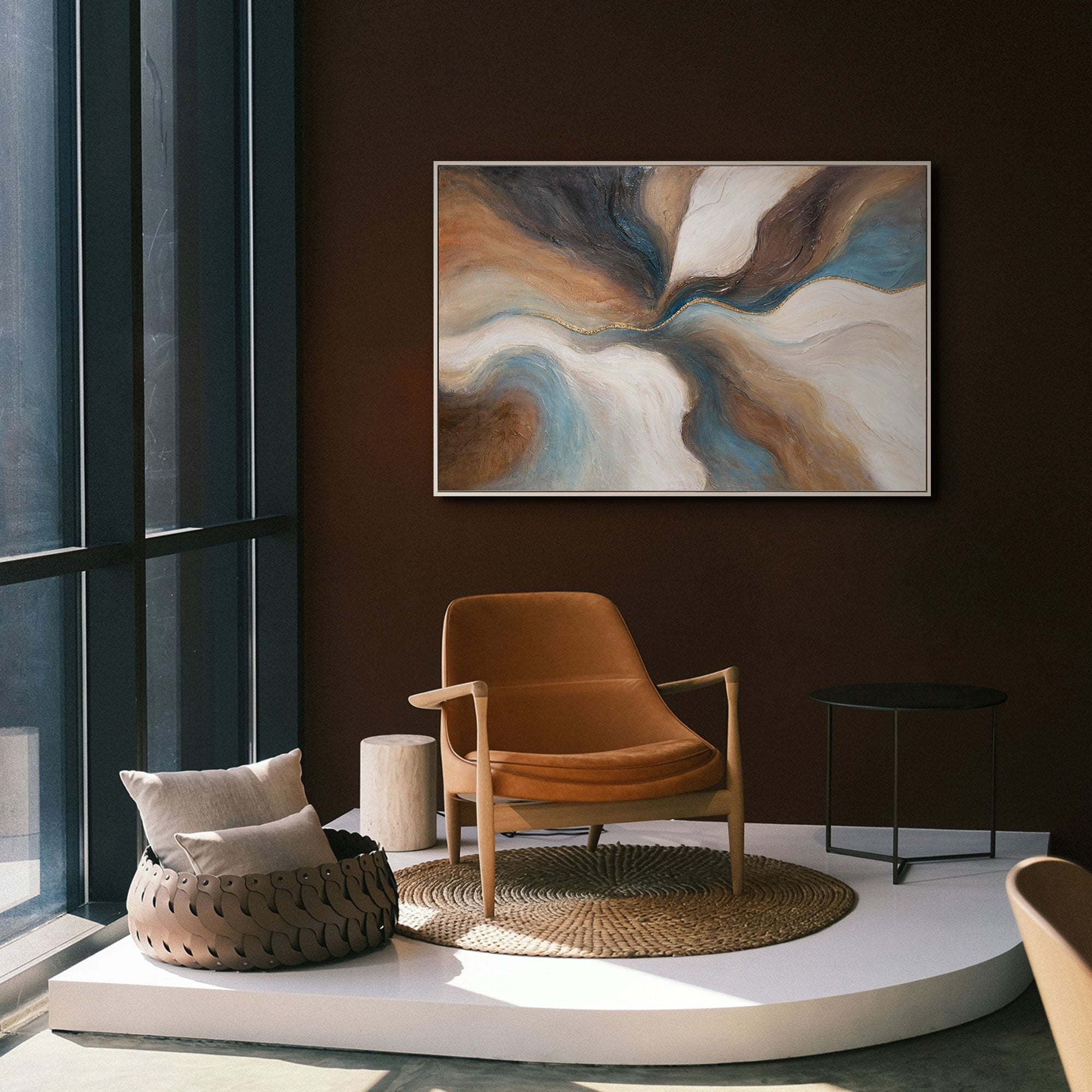 Käsinmaalattu canvas taulu „Ajan kuluminen“ yhdistää voimakkaat ruskeat ja siniset sävyt pehmeisiin beigen ja valkoisen korostuksiin. Kultainen viiva kulkee läpi teoksen kuin hienovarainen halkeama, joka symboloi ajan ja liikkeen dynamiikkaa. Rakenteellinen pinta tuo syvyyttä ja antaa maalaukselle vaikuttavan elävyyden.