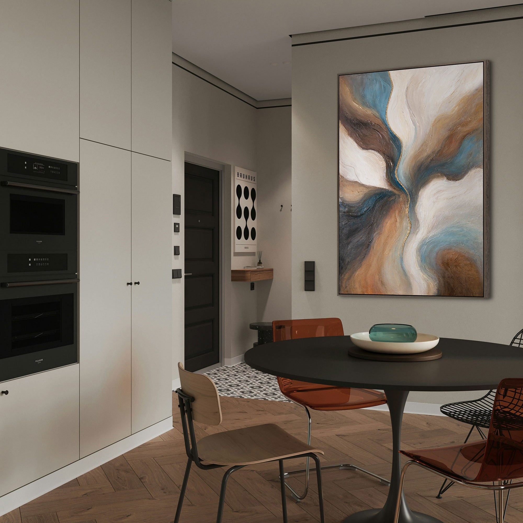 Tämä abstrakti maalaus sopii täydellisesti moderneihin, minimalistisiin ja elegantteihin sisustustyyleihin. Se antaa olohuoneelle, makuuhuoneelle tai toimistolle erityisen ilmeen ja luo ilmapiirin, jossa yhdistyvät rauha ja voimakas energia.