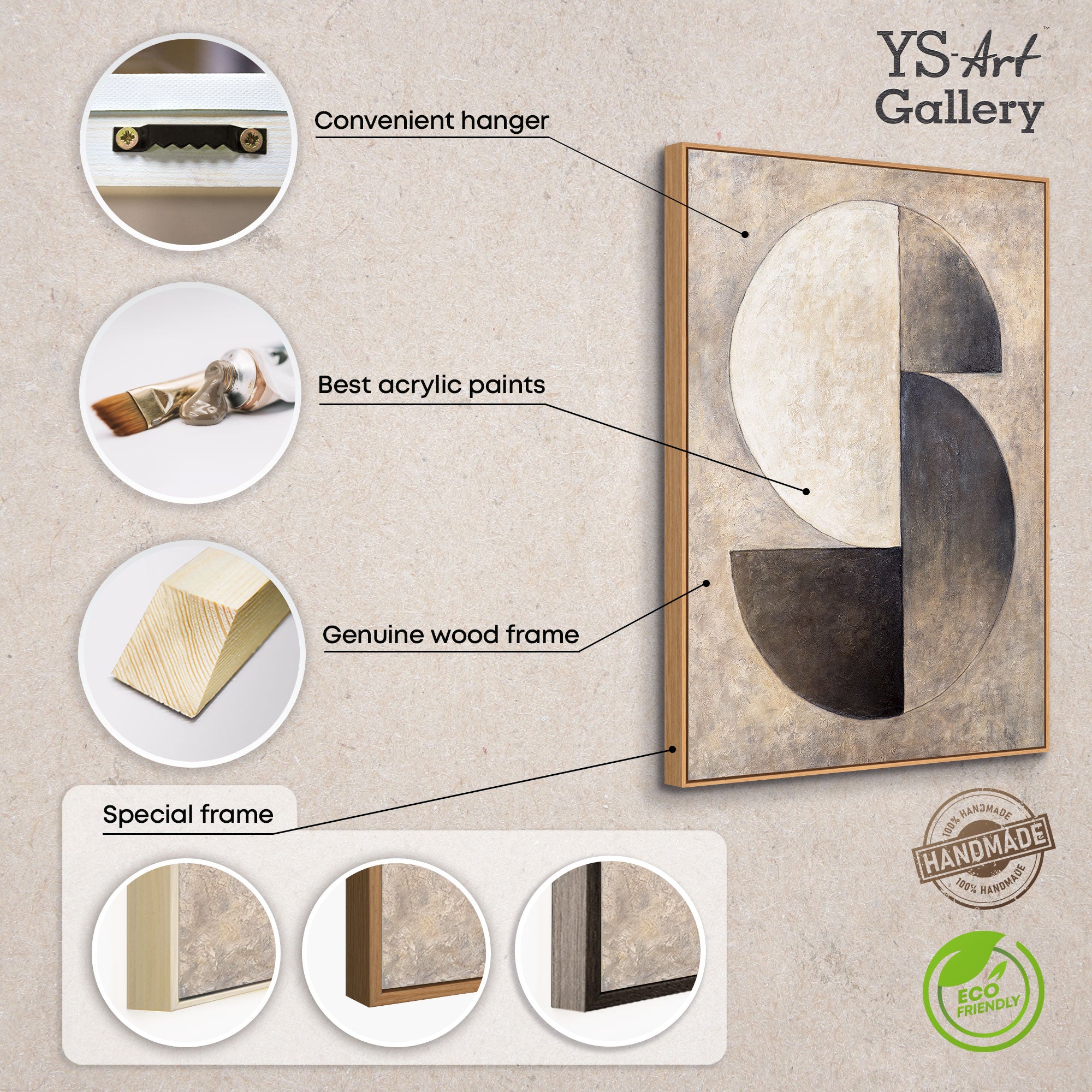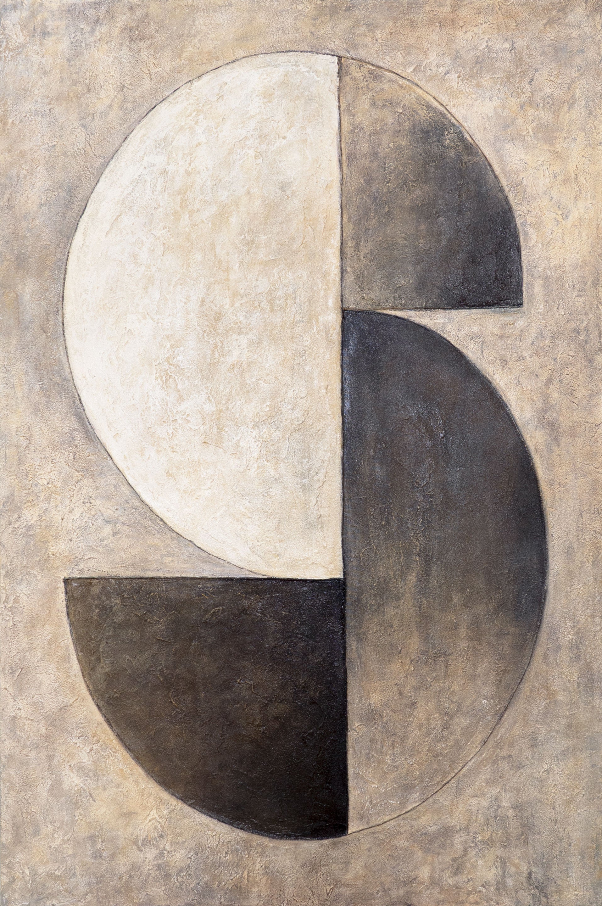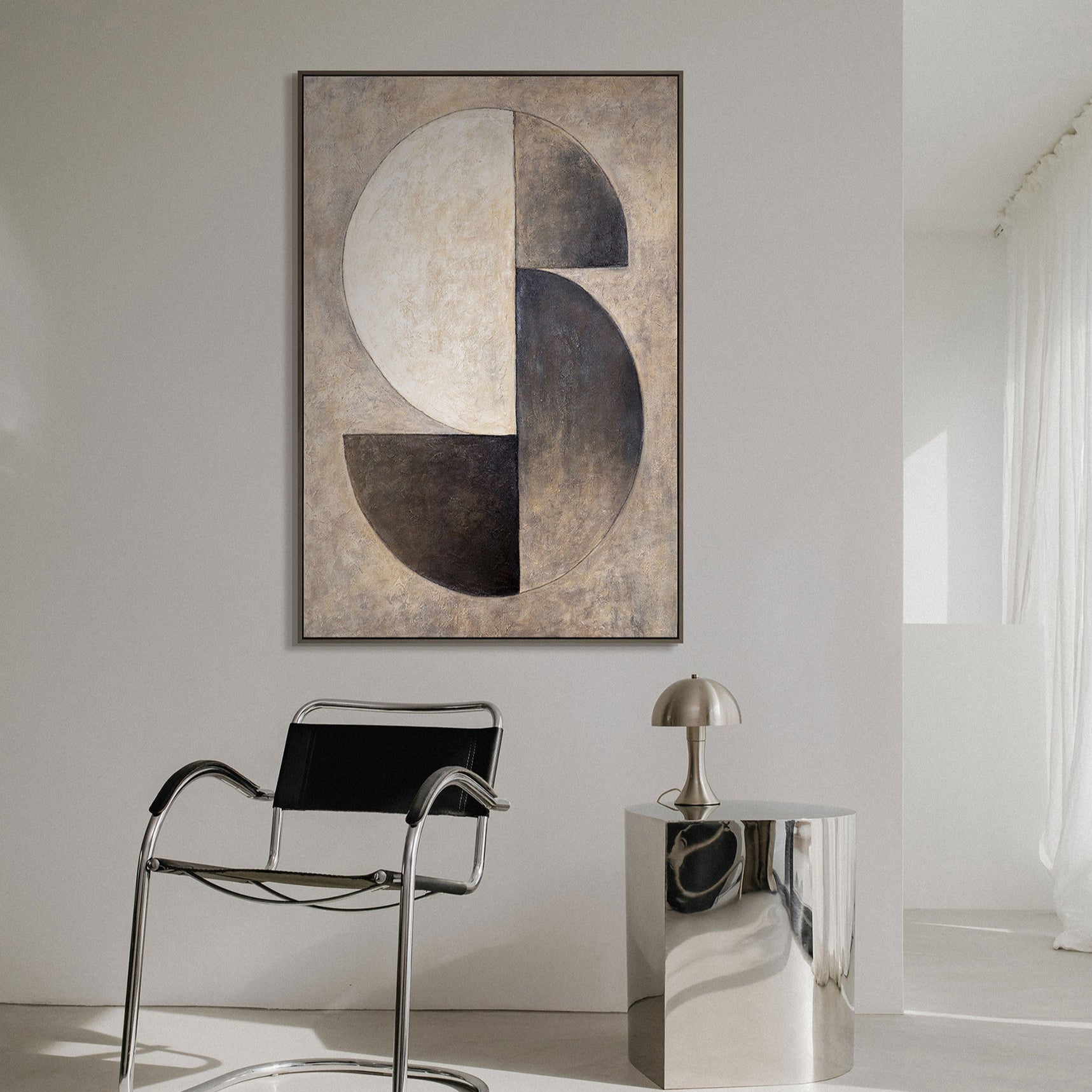 Tuo modernia selkeyttä ja geometrisen tyylikästä ilmettä kotiisi tällä käsintehdyllä canvas taulu -teoksella. Mustat, valkoiset ja beiget puolikkaat ympyrät luovat kiehtovan vuoropuhelun symmetriasta ja kontrastista – taideteos, joka säteilee tasapainoa ja ilmaisun voimaa.