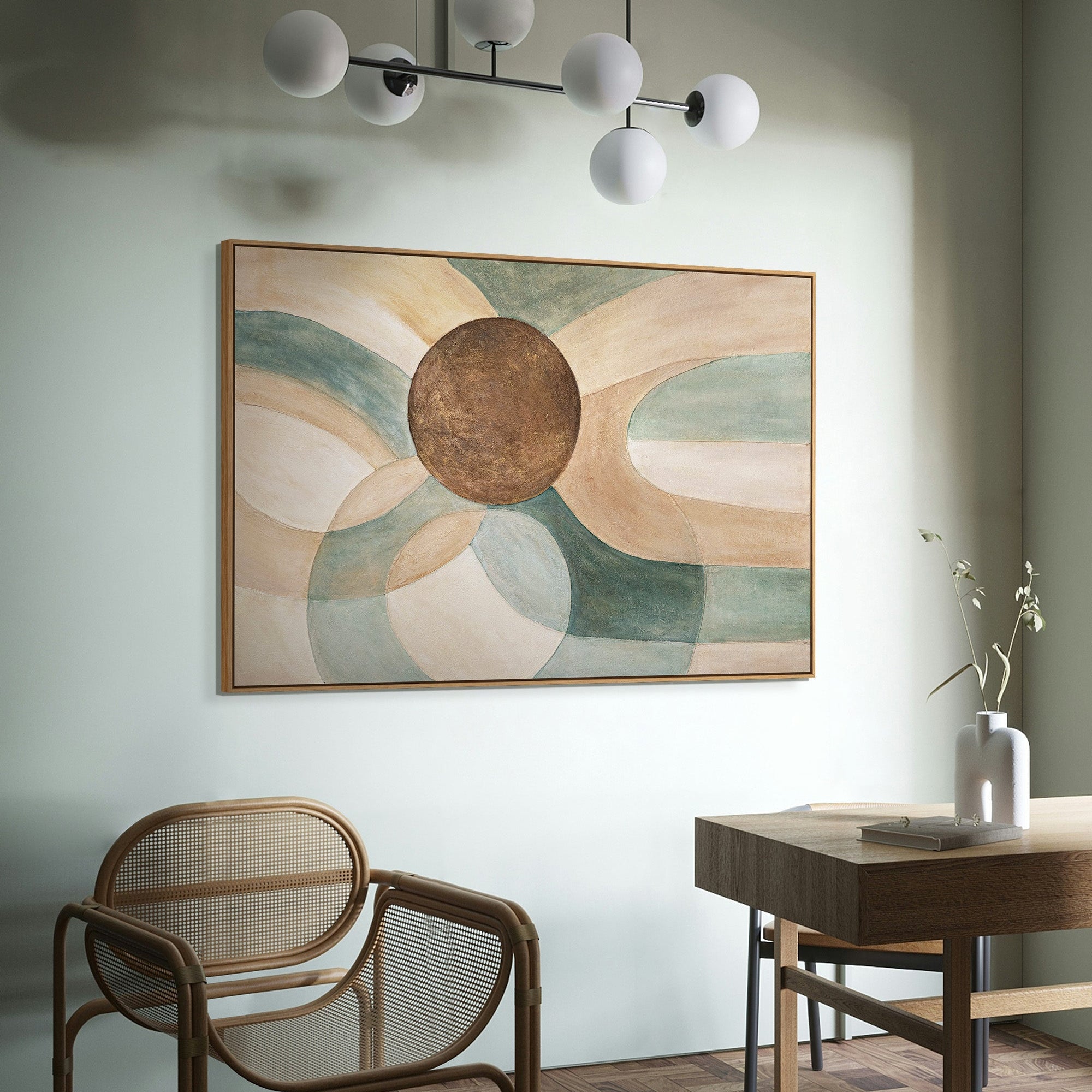 Tämä käsinmaalattu kankaalle tehty taideteos on kehystetty ja sopii erinomaisesti seinätaideteokseksi olohuoneisiin, makuuhuoneisiin tai hiljaisiin työtiloihin. Hellävarainen väripaletti luo harmonisen tunnelman ja sulautuu saumattomasti moderneihin sisustuksiin.