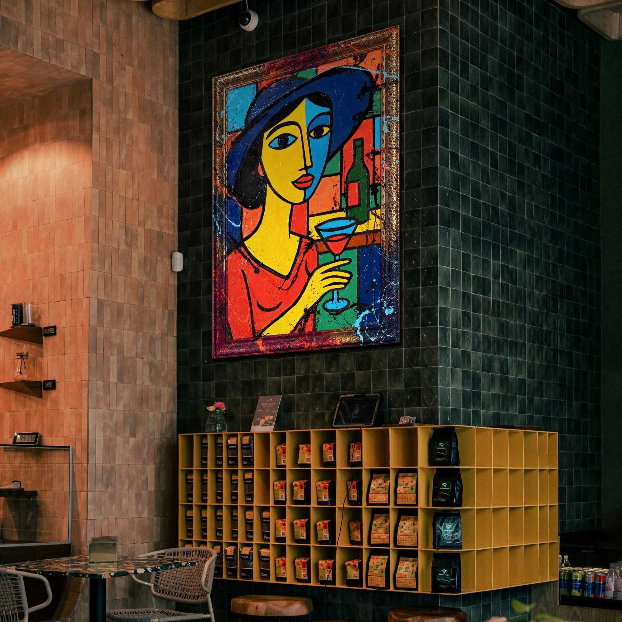 „Dame in der Bar“ zeigt eine stilisierte Frau mit Hut und Glas im kubistisch inspirierten Pop-Art-Stil. Klare Linien, kräftige Farben und kontrastreiche Formen verleihen diesem Gemälde eine unverwechselbare Präsenz. Der Hintergrund in leuchtenden Farbfeldern mit Flasche und Glas verstärkt den modernen Charakter des Bildes.