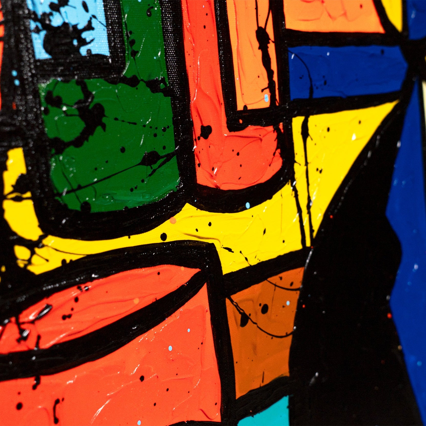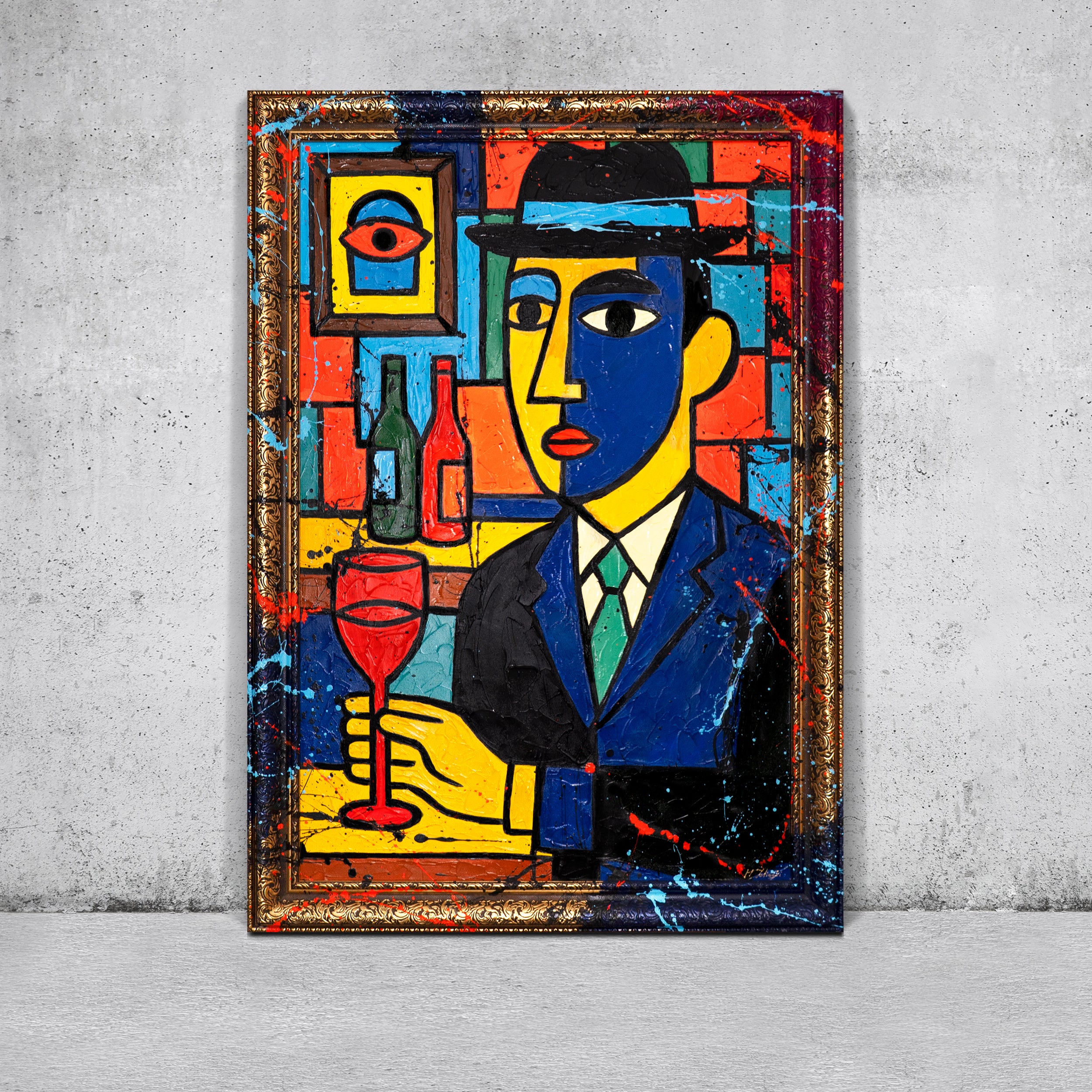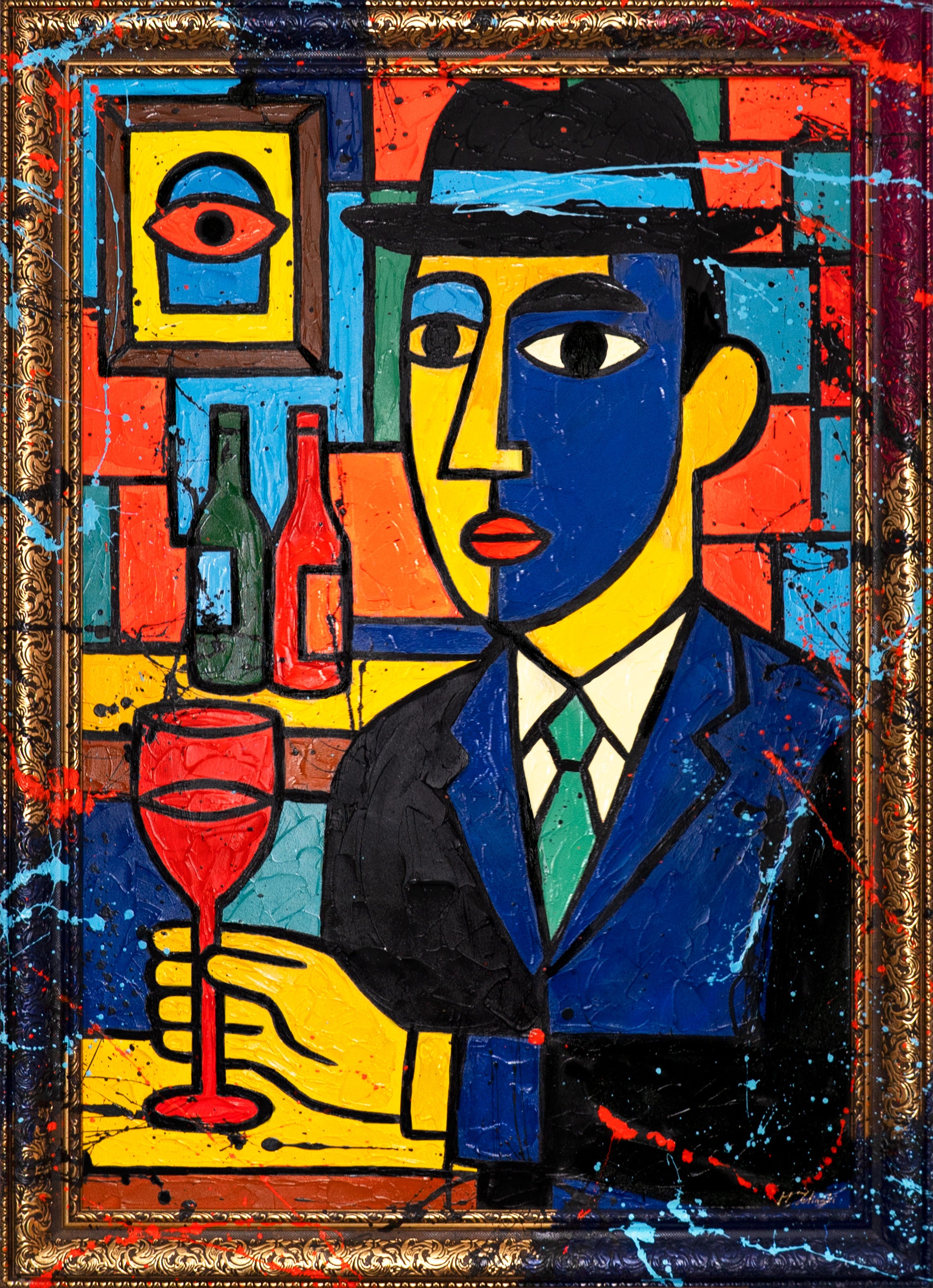 „Bar“ zeigt das Portrait eines Mannes im kubistischen Pop-Art Stil – in kräftigen Gelb-, Blau- und Orangetönen, ergänzt durch grüne Akzente. In der Hand hält er ein Glas Rotwein, während Flaschen und ein symbolisches Bild mit Auge im Hintergrund das Werk ergänzen. Die klaren Linien und kontrastreichen Farbfelder machen dieses Gemälde zu einem urbanen Statement moderner Kunst.