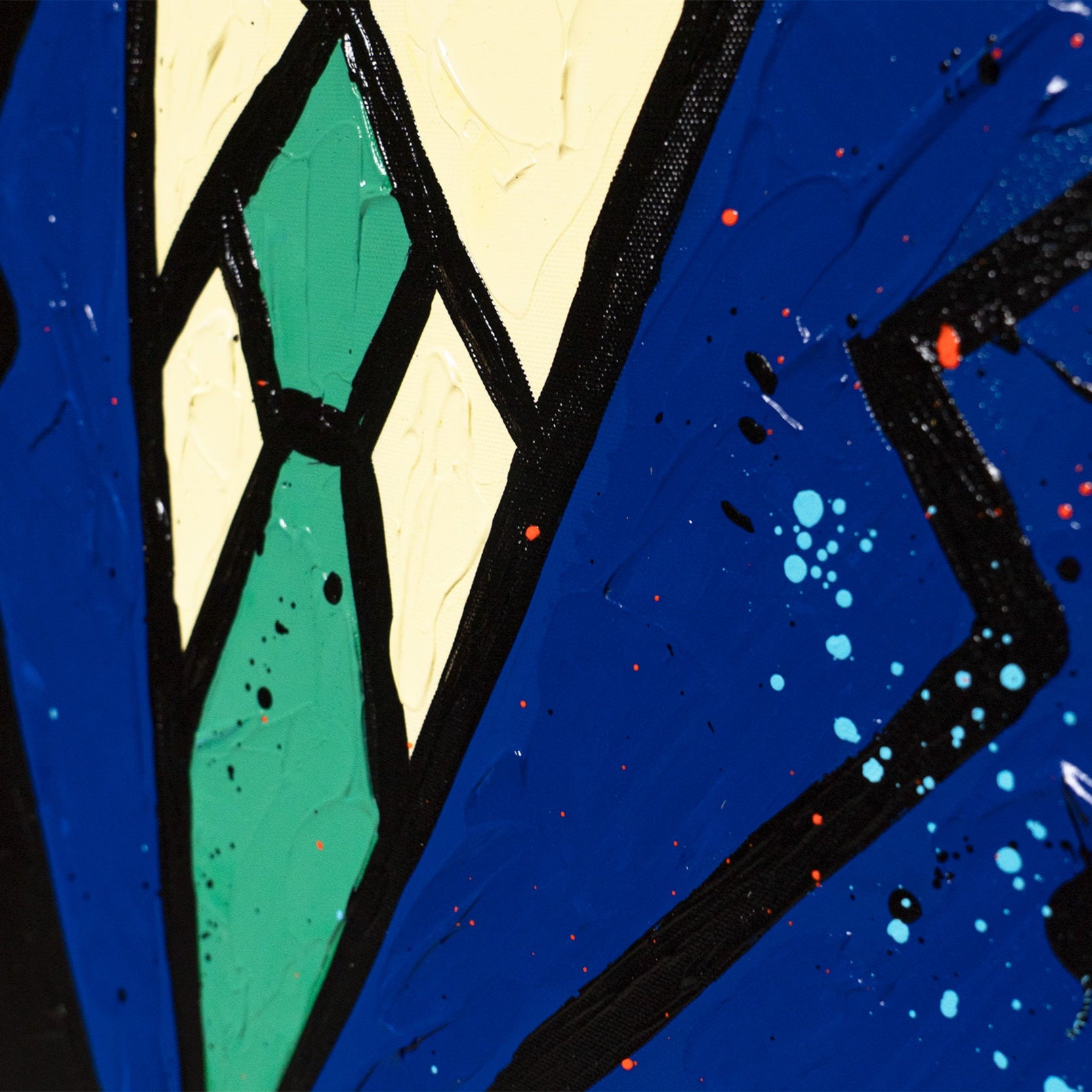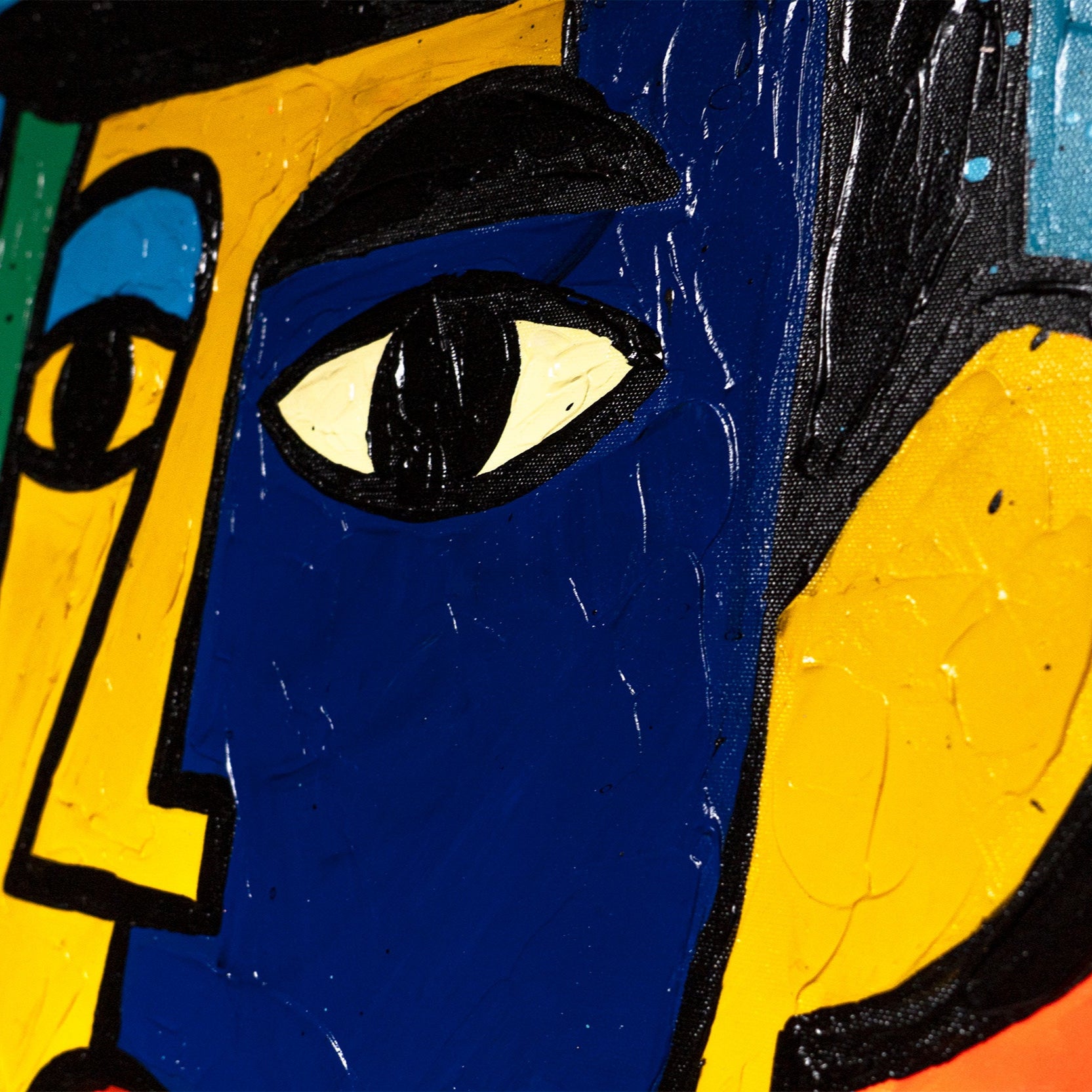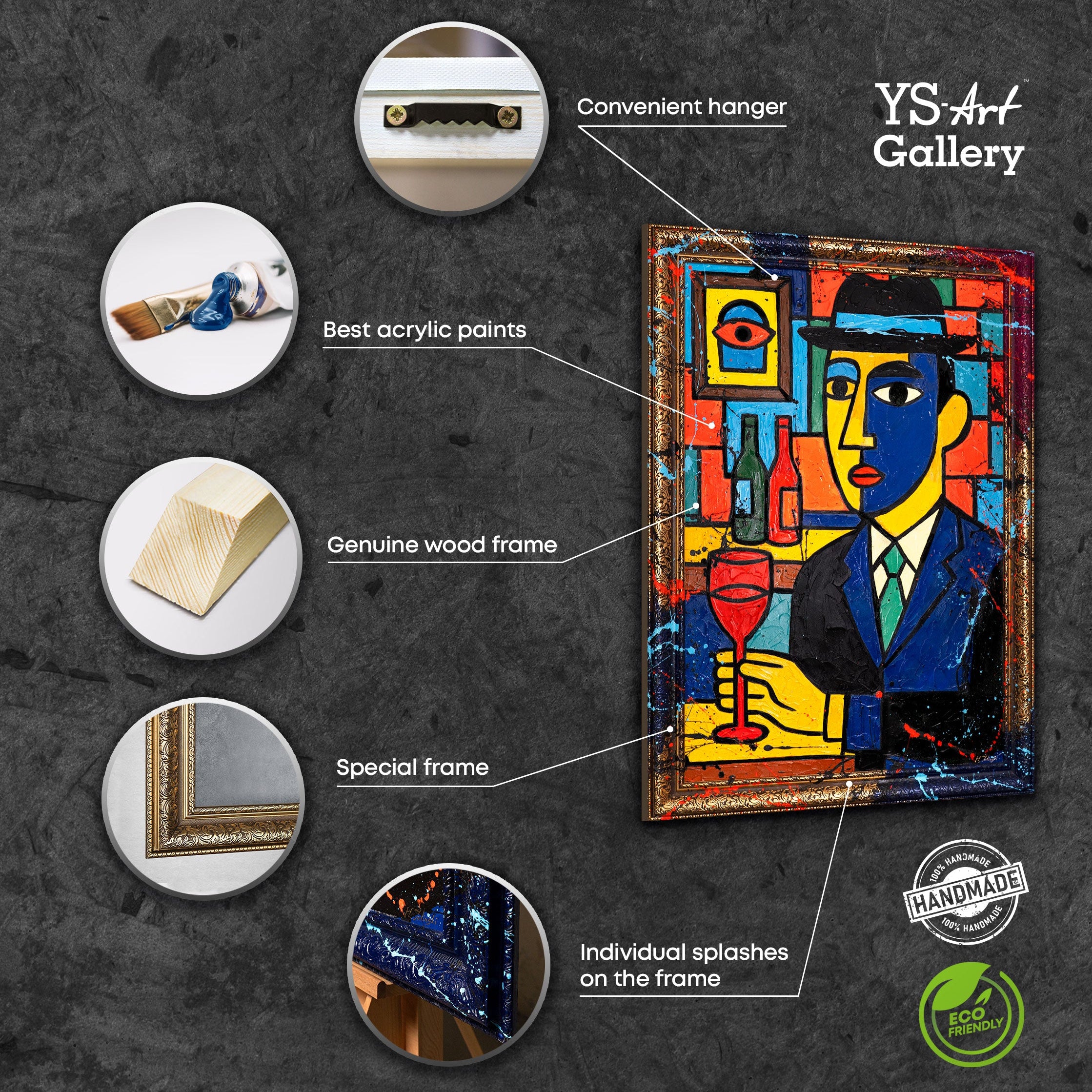 „Bar“ zeigt das Portrait eines Mannes im kubistischen Pop-Art Stil – in kräftigen Gelb-, Blau- und Orangetönen, ergänzt durch grüne Akzente. In der Hand hält er ein Glas Rotwein, während Flaschen und ein symbolisches Bild mit Auge im Hintergrund das Werk ergänzen. Die klaren Linien und kontrastreichen Farbfelder machen dieses Gemälde zu einem urbanen Statement moderner Kunst.